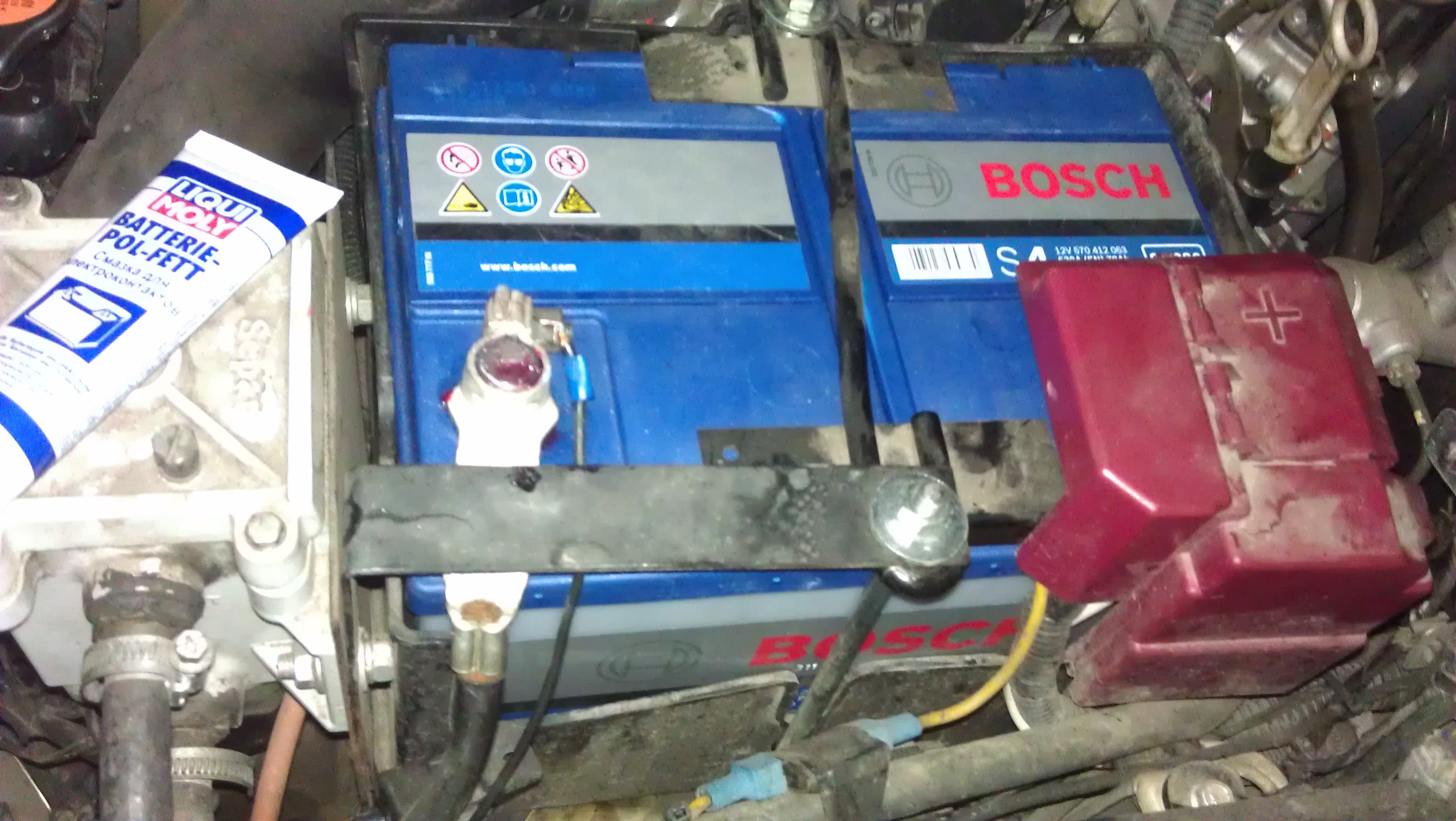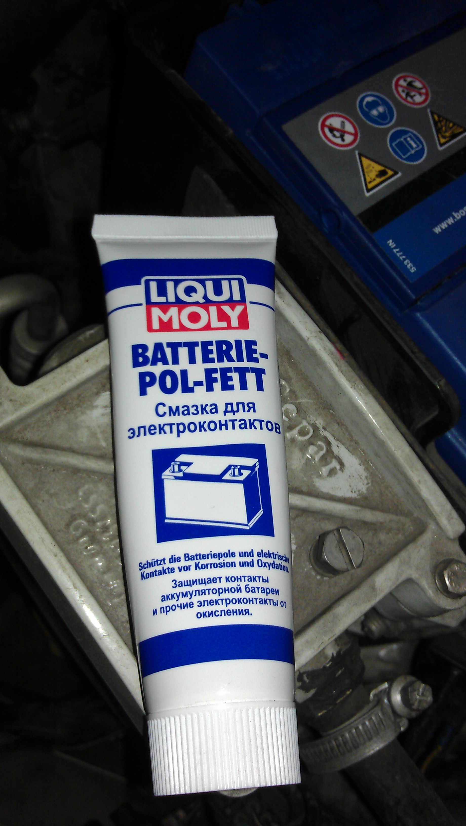 Купил первую попавшуюся на авторынке смазку для контактов Liqui Moly Batterie Pol-Fett и обмазал клеммы.