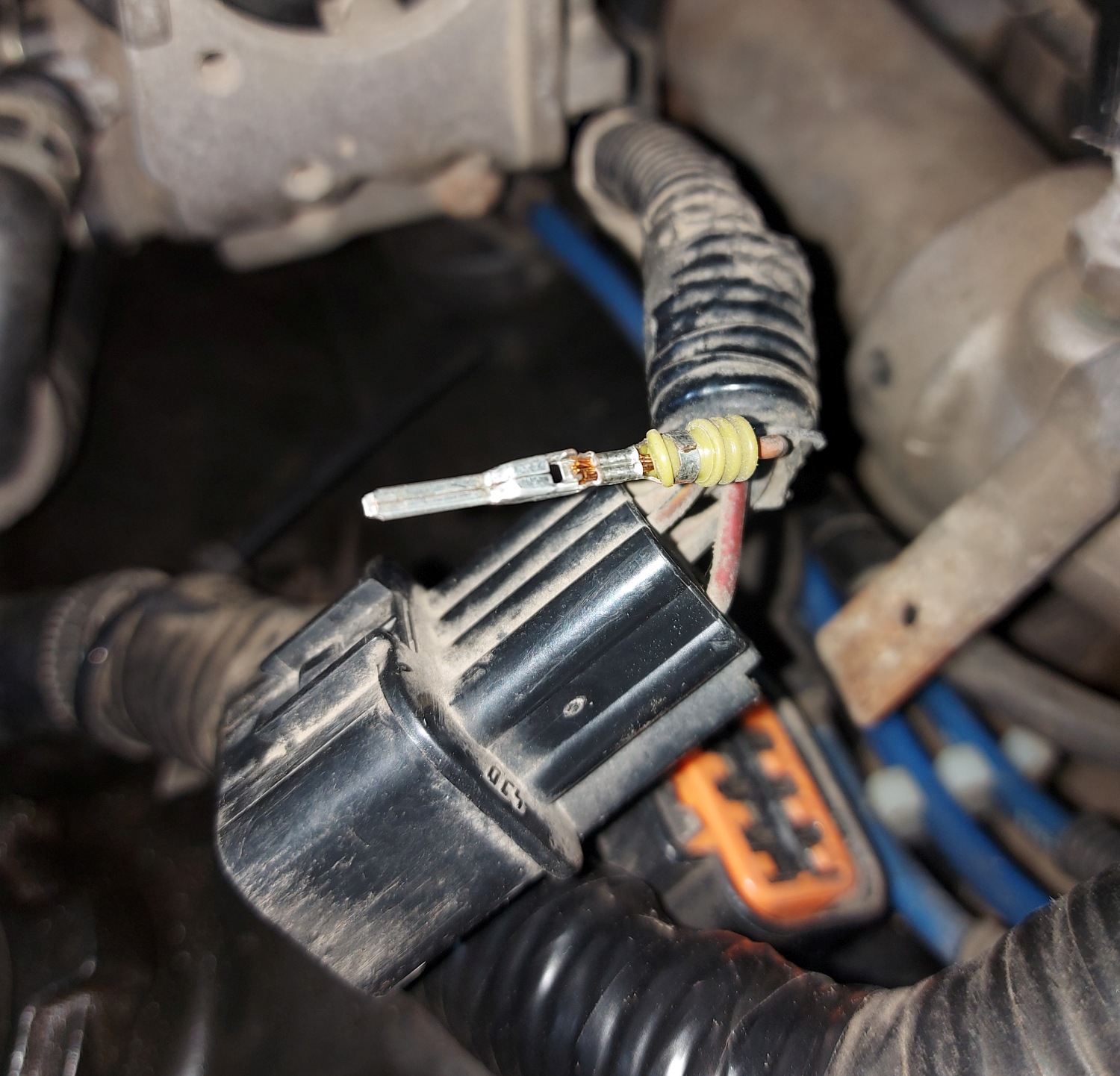 Дома в гараже быстренько открыл капотик, думаю по горяченькому обследую разъем, пока провода хорошо гнутся.