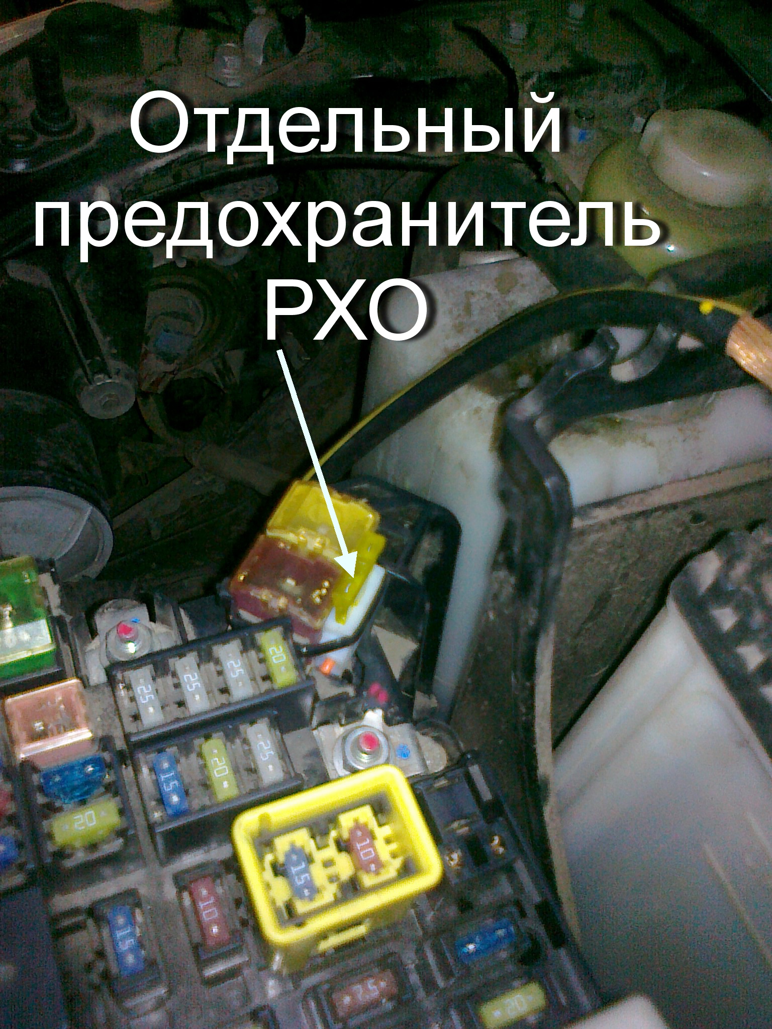 Место установки подбирали исходя из требований по его влаго- и грязезащищенности, однако, чтоб была возможность регулировки и легкого доступа к предохранителю. Тянуть фарные провода в салон сочли не целессобразным, поэтому установили мне реле в коробку предохранителей под капотом, в ее нижнюю часть. Совместили существующее в коробке отверстие с кнопкой РХО. Регулировку легко производить путем нажатия на кнопку на реле подходящим стержнем (например, хвостовиком небольшого сверла).
