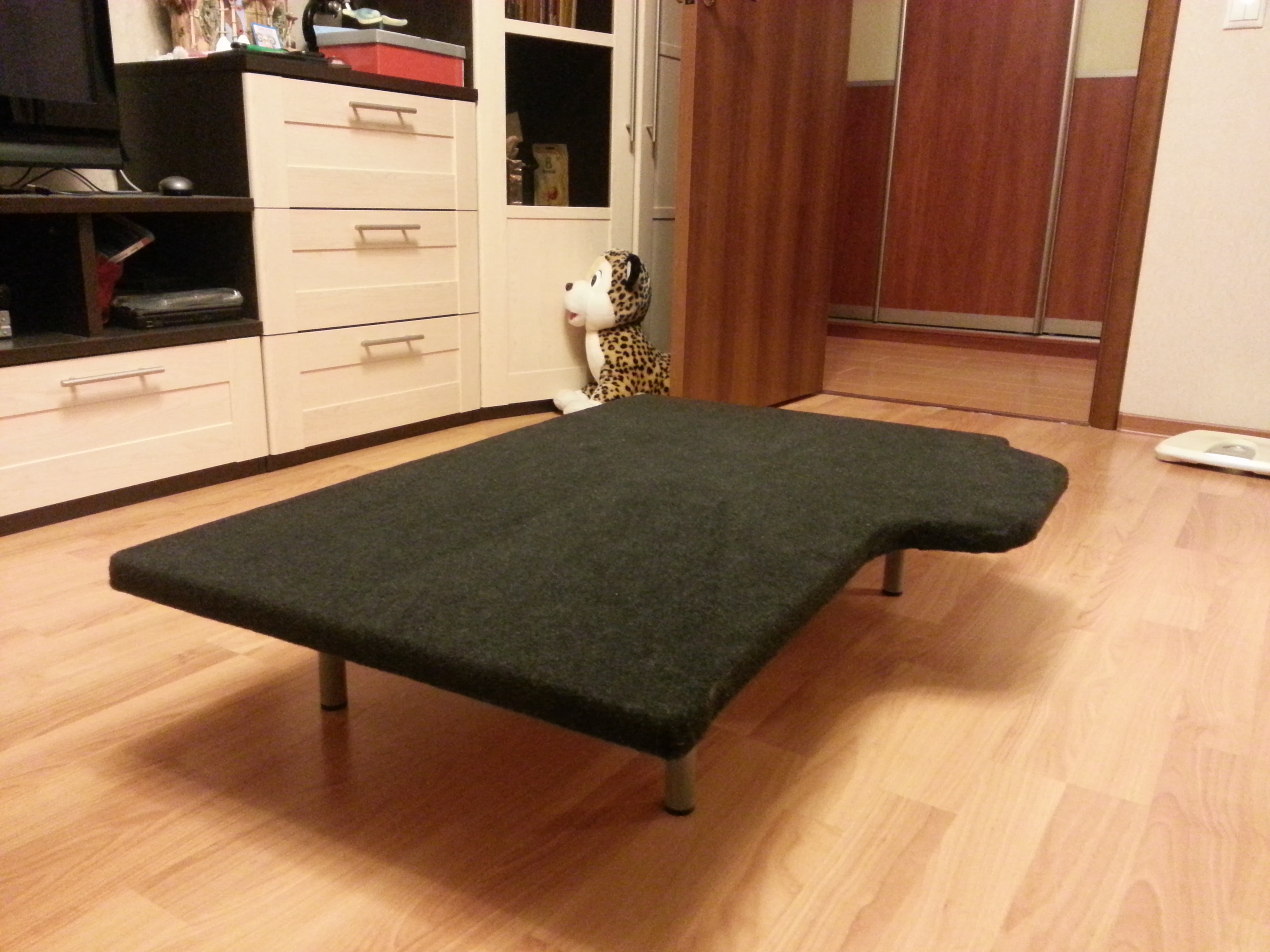 Ножки и фанеру покупал в леруа, ковролин на авторынке. Если не изменяет память за все получилось около 1200р. Времени потратил 0,5 дня
