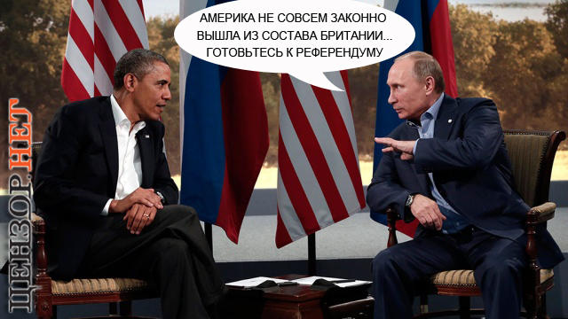 - Мистер президент, мистер президент!!! Я только что позвонил в Кремль, как вы мне приказывали...Говорю им: Отдайте Крым, кляты! Иначе плохо вам будет!!!..А Путин в ответ: "Иди в жопу, ушастый!..А ещё раз позвонишь - будешь аренду за 60 лет платить!!!"...Позвоните ему, скажите, чтобы не обзывался...