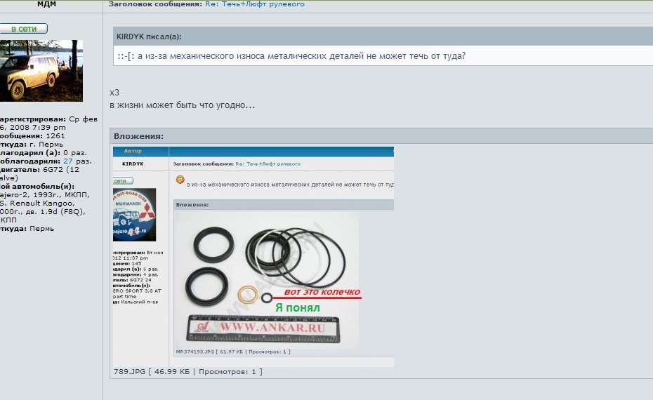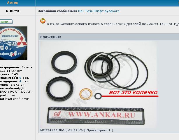 KIRDYK, там не колечко и не уплотнение, там сальник, хитрый, и он не идёт ни у каких ремкомплектах. За ним идёт подшипник, который стоит около1800 помоему, снять одно без другого никак. Ну и про подшипник "снять" тоже понятно наверное.