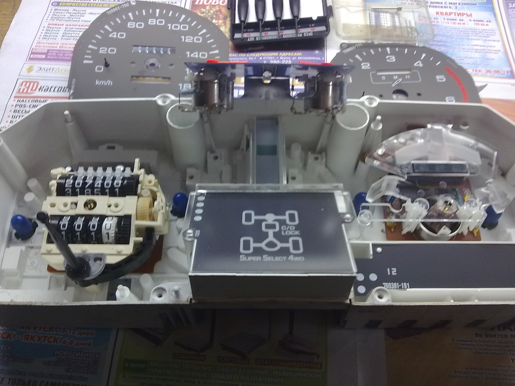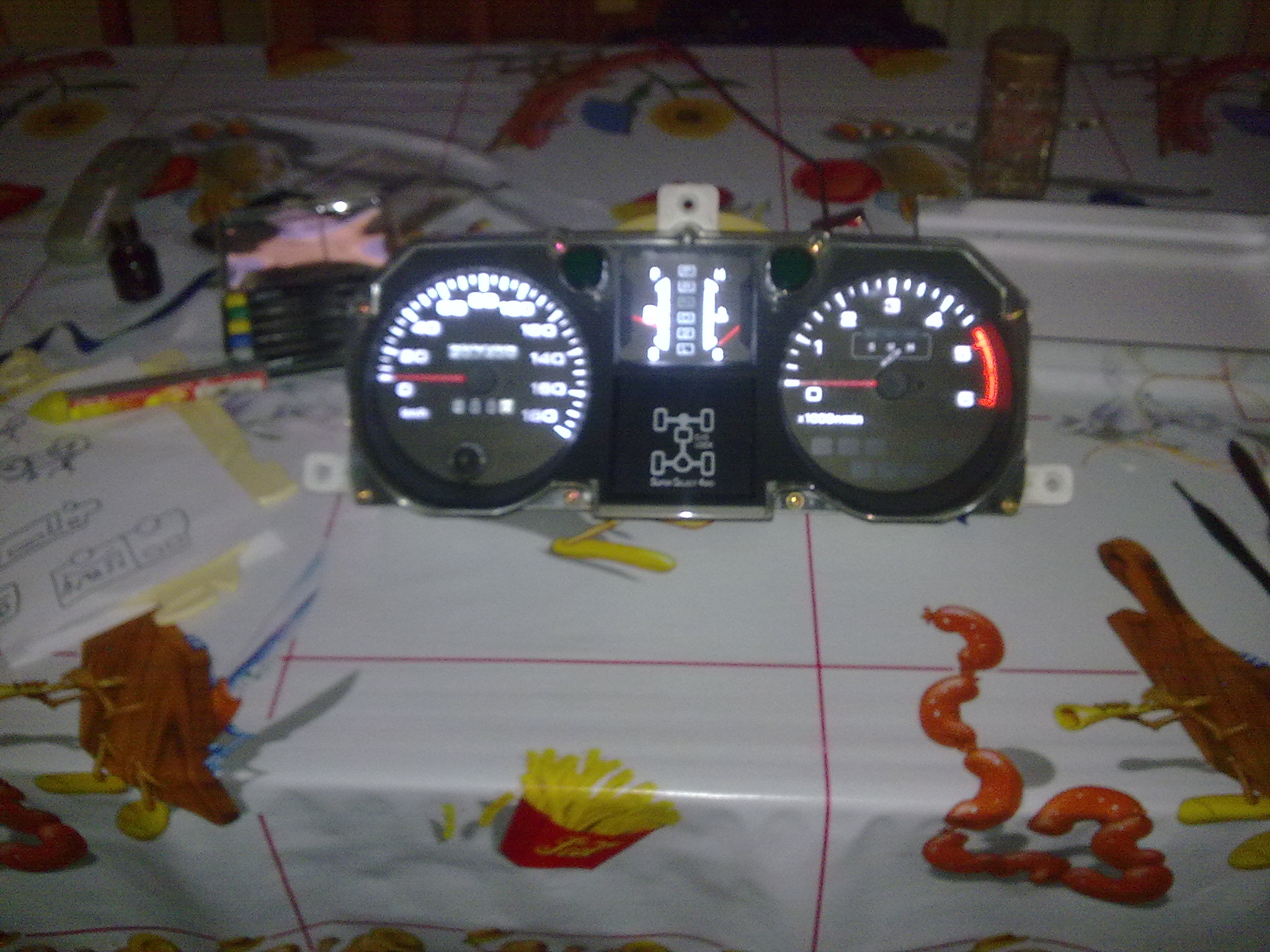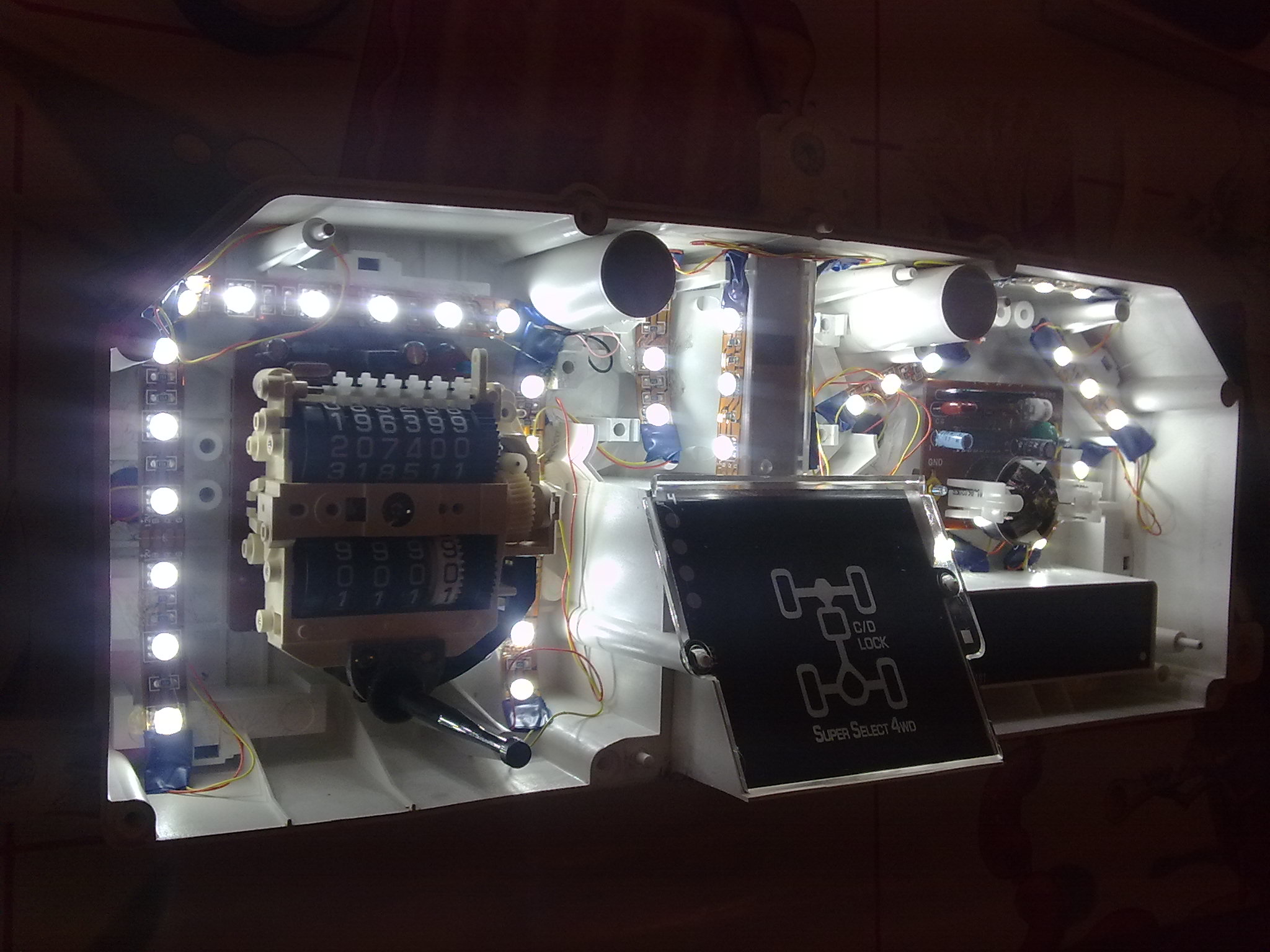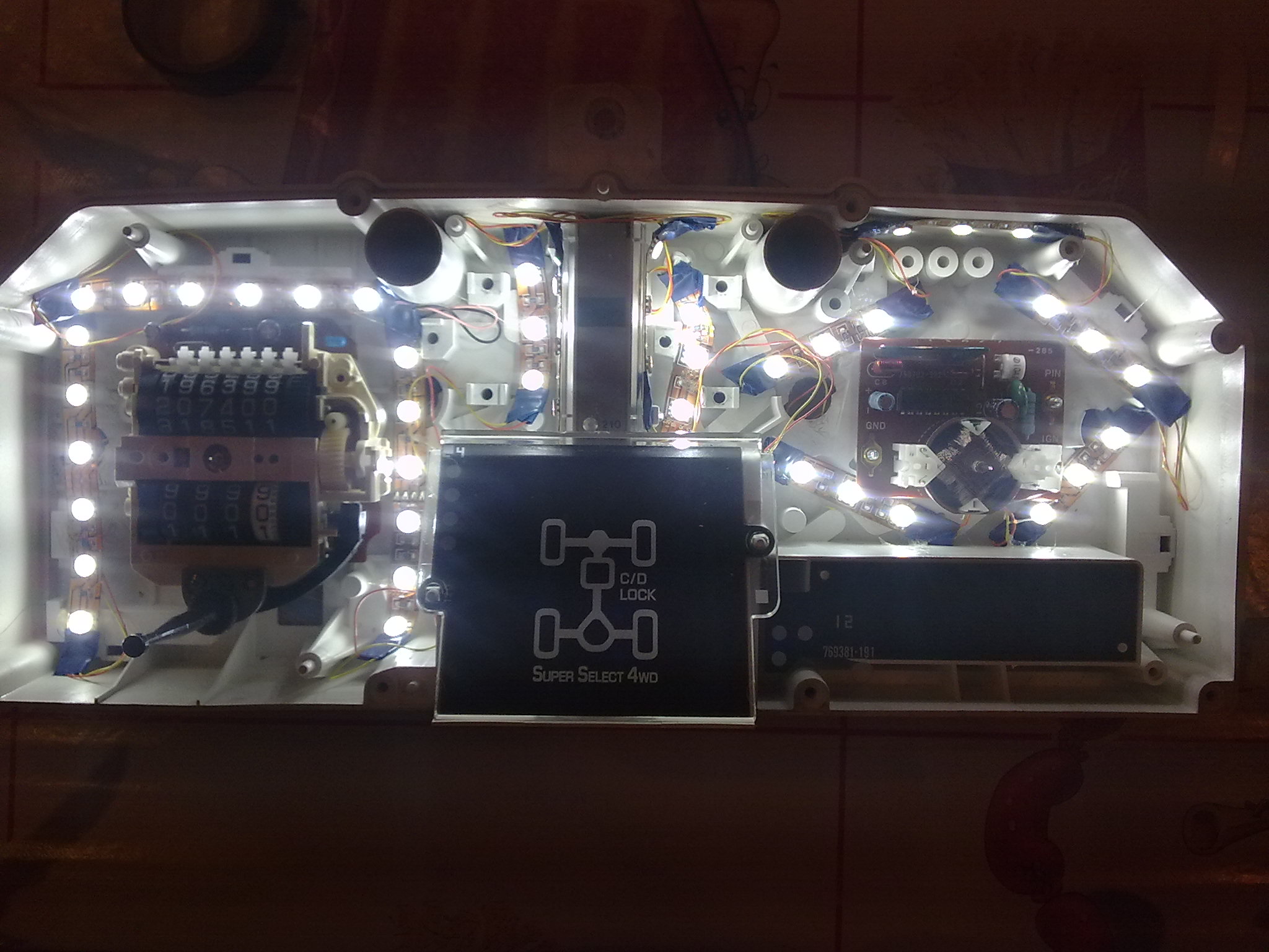 Сегодня все воткнул,работает:стрелочки,шкала,но мои опасения сбылись - ой как я не хотел лампочки на диоды менять на режиме скоростей,колесах(2вд,4вд),поворотках,а надо парни так как тускло они смотрятся на общем фоне,опять приборку разбирать ::-): (красные еще более менее а зеленые менять).