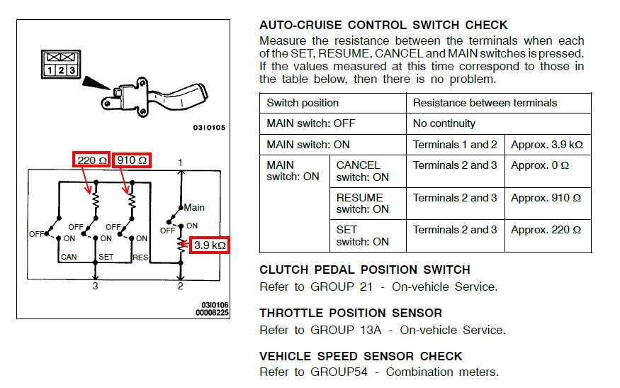 3. Опытным путём установлено, что если на фишке, идущей от бортсети к разъёму часовой пружины, закоротить провод сигнала на один из проводов круиза, лампа CRUISE на панели зажигается и гаснет каждый раз при замыкании контактов. Работоспособность КК проверить не удаётся, т.к. лампа CRUISE зажигается и тушится любым резистивным сигналом с переключателя - 100 Ом, 887 Ом, 300 Ом, замыканием накоротко... Да и не порядок это, использовать для управления КК линии от дуделки. Манипуляции с остальными тремя контактами в этой фишке не дают вааще никакого результата.