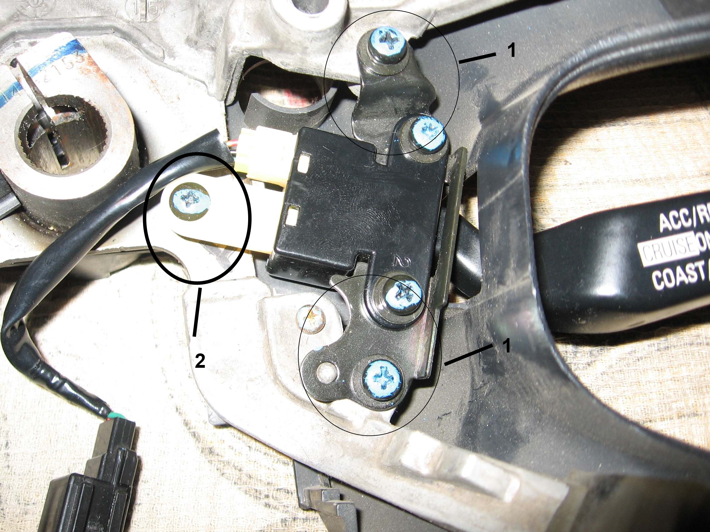 После рестайлинга систему упростили, убрав один пин (и соответственно, проводок из кабеля от лапки на часовую пружину) и немного изменив схему резистивного управления. 1 на ней отсутствует, 2 и 3 отвечают за всё: активация/деактивация КК + смена режимов работы.