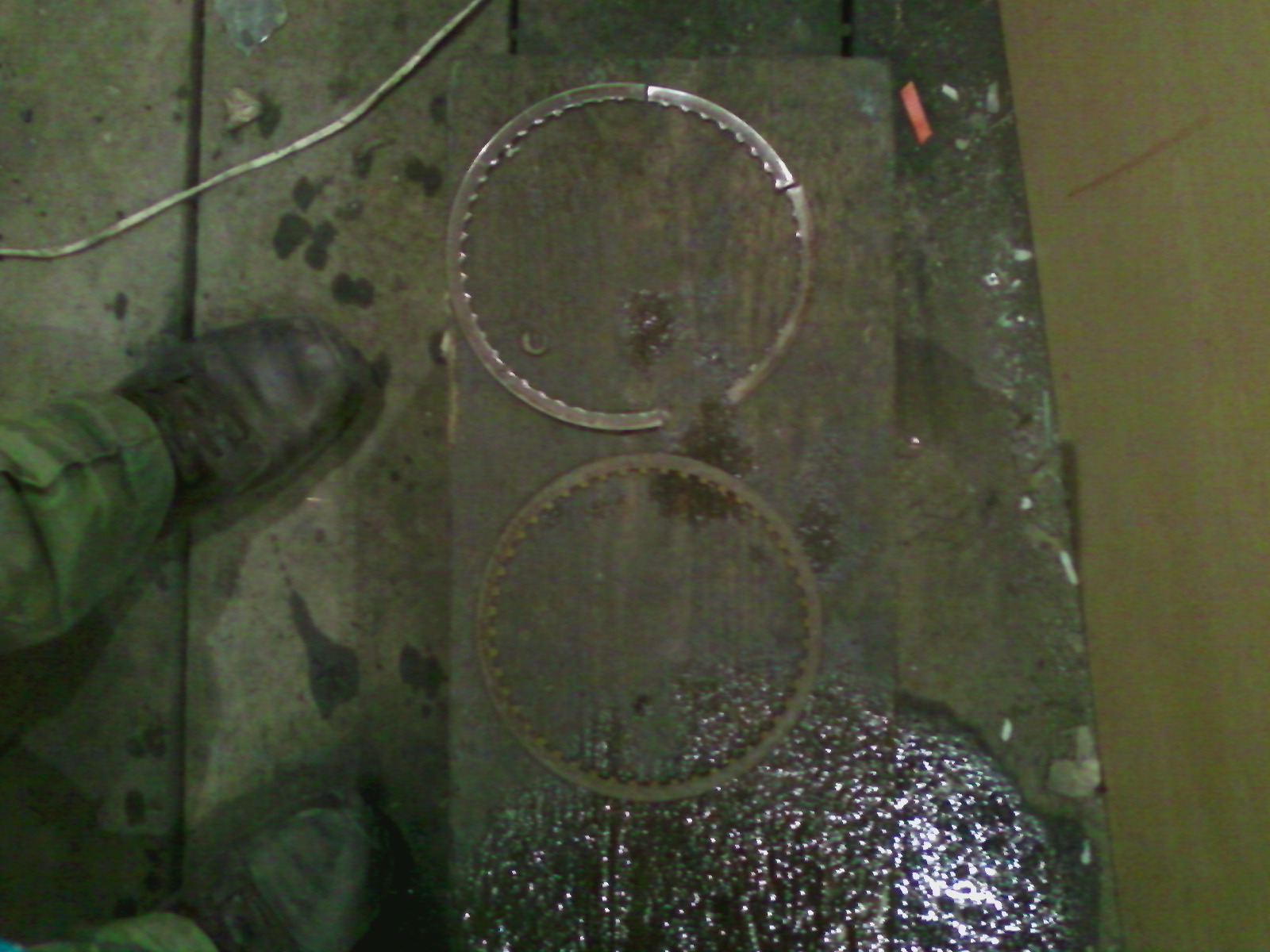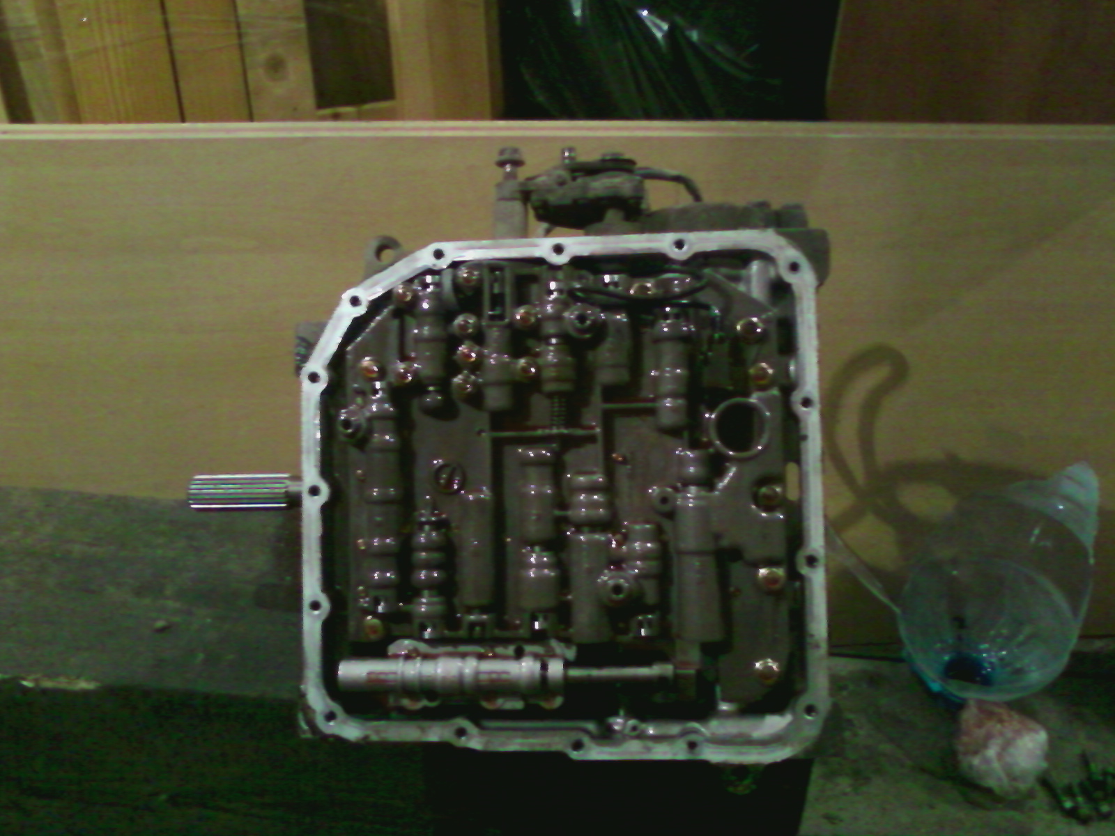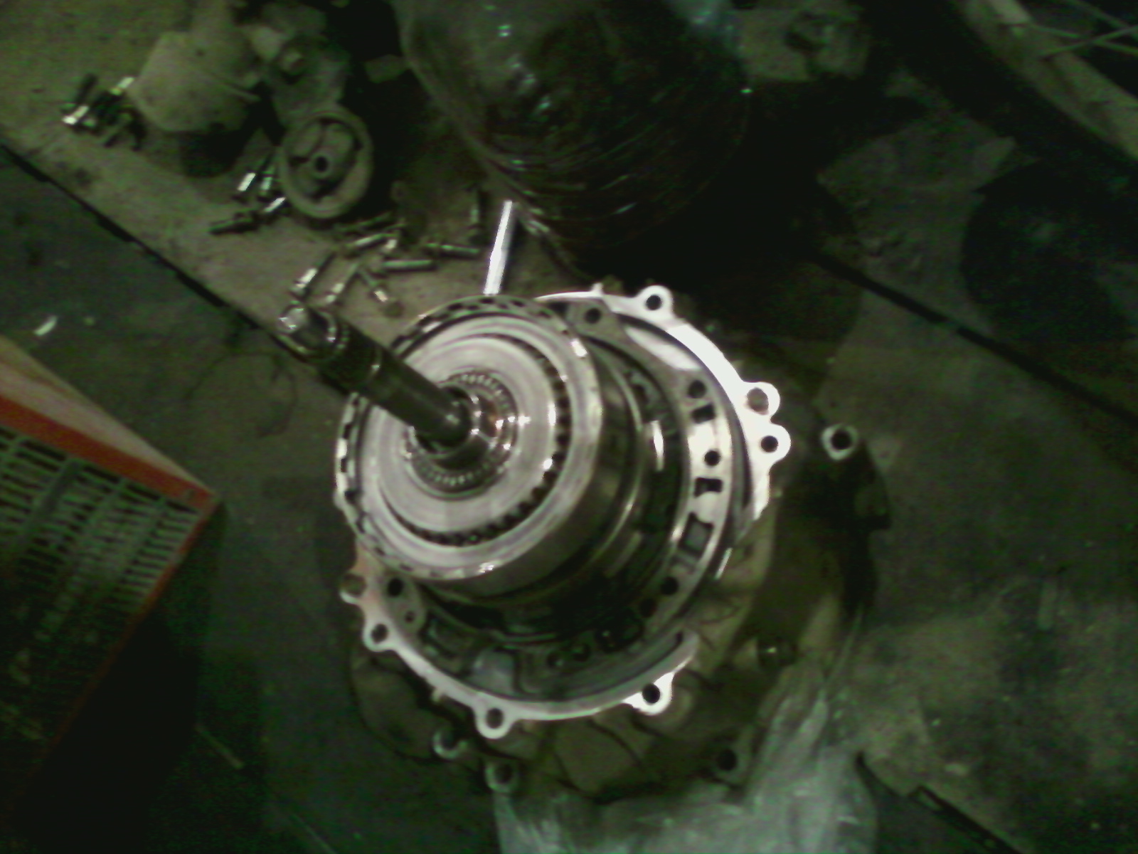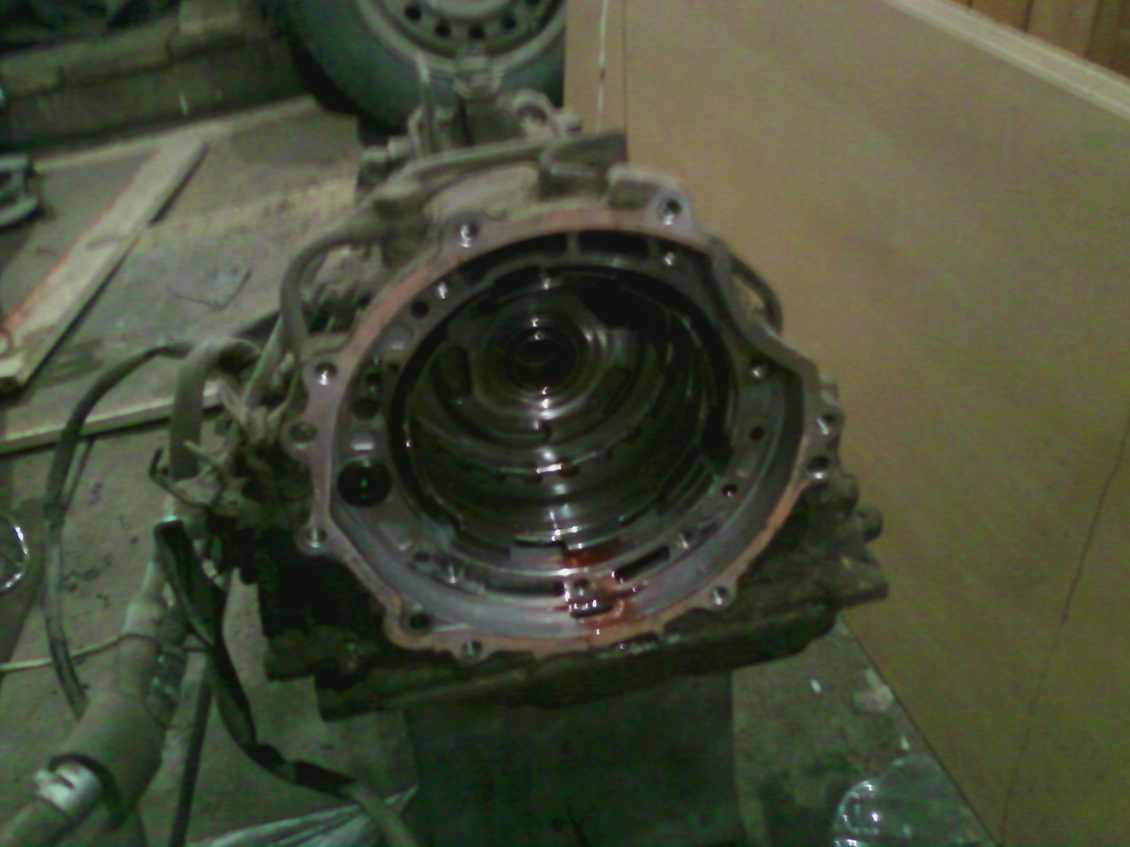 Всем привет! Пришло мое (или пыжика моего время). Заднего хода нет месяца 3, паркуемся на горках, толкаем и т.п. Выкладывал выше фотку, что выпало при чистке фильтра и свои соображения по стоимости ремонта. Итак: заехал на яму, снял коробку. Один в течении двух дней (с задействованием часа по 2-3). Два верхних болта доставили неудобство, но "и не таких быков в консервную банку запихивали". Особенно, когда открутил коллектор впускной и стартер. Еще повозился с разъемами и патрубками, немного приопустил, потом отстыковал. Гидротрансформатор на трех болтах, есть лючок. Весит коробка немного. Масло сливал и до и после, но добрая часть все же - на полу. Сегодня произвел вскрытие - 1,5 часа (первый опыт). Хотелось бы вернуться к ценам: и за это - 18 тыров!?!? Нашел расколотое кольцо - одно! Еще одно - явно потертое. Оба по 800 р в EXISTе. Жду железяки. По разбору. Можно не снимать заднюю крышку, поддон и блок клапанов. Я снял по неопытности - все держит единственное стопорное кольцо со стороны "колокола", снимать надо только его. Еще вынимал датчики (оборотов валов видимо) и выкручивал все контрольные болты (на 12, штук 5-7 их), посажу потом все это на герметик. Никаких резинок там нет. Есть два сальника в торцах коробки, но это скорее снаружи. Да, возле блока клапанов - наш любимый штифт - не потеряйте. Пофотал не телефон для памяти, собирать буду, сделаю подробно. Диски промерял штангелем - все как один 1,8мм и в здоровом и в больном блоке, "потертый" - 1,7мм - заменим. Вот собственно и все. Смотрите картинки.