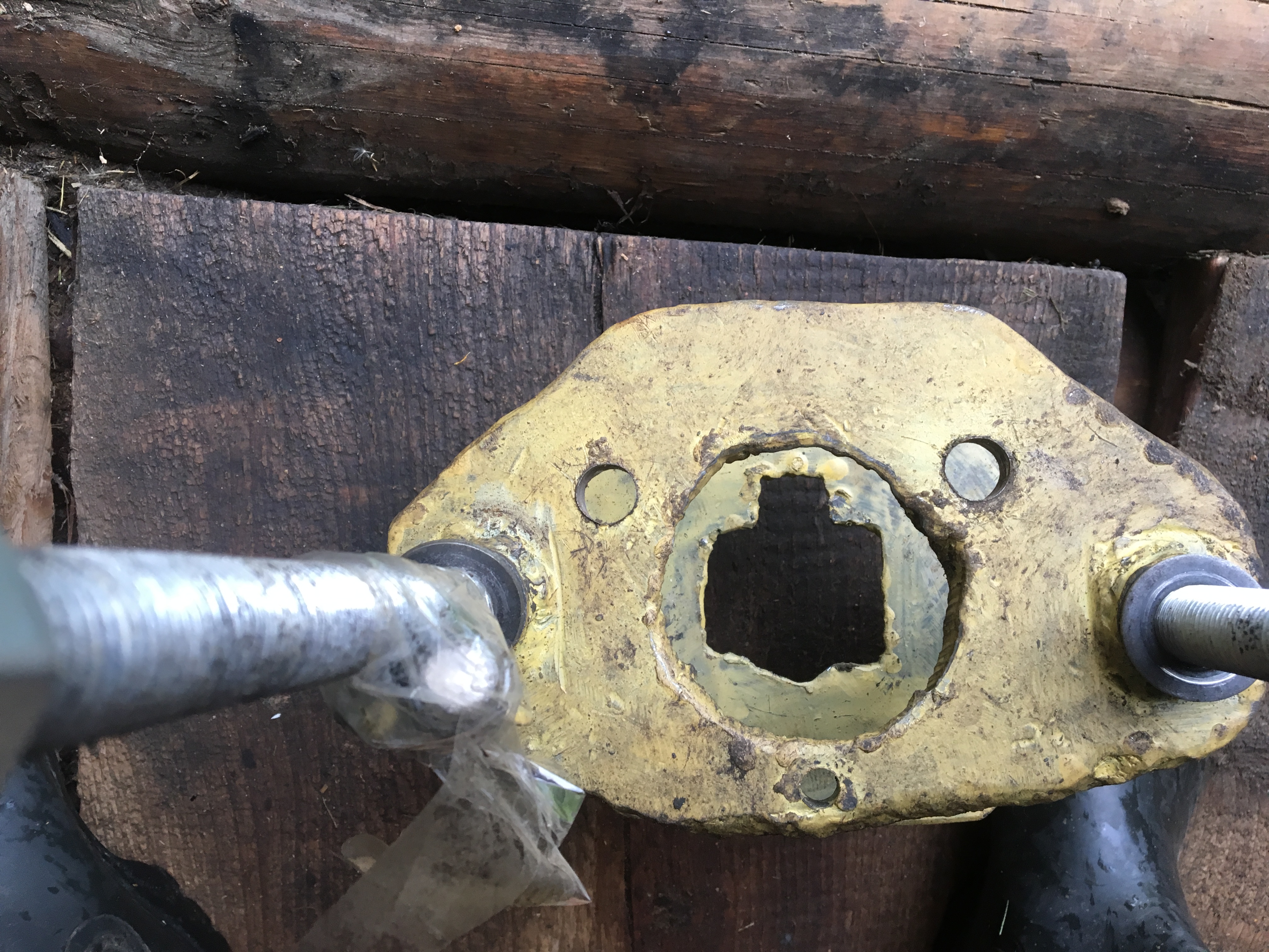 Добавил фоток, верх отверстия под чашку, а низ вырез чтобы вставить стойку.Резьба у меня М20, хватит и 16, только гайки длинные, в любых метизах, метр резьбы как раз пополам на две части хватает четыре гайки и четыре втулки,перед сваркой втулки приверните верх и низ чтобы симметрично было, я прохлопал это дело,пришлось перепиливать одну сторону на фотке видно по корявой сварке.И серпик,кусок железки чтобы стойку не косило,под низ на фото хорошо его видно, пришлось ковать!