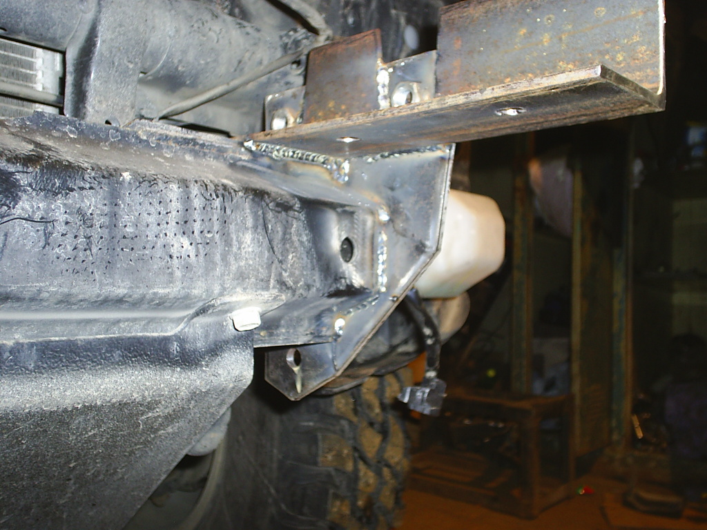 По крепежу: с 2-х сторон от рамы ,начиная от чашек кузовных подушек,привариваешь " домики" на манер крепления сток бампера на П-2....можешь ещё завязать полку лебедки на поперечину рамы( труба под радиком)