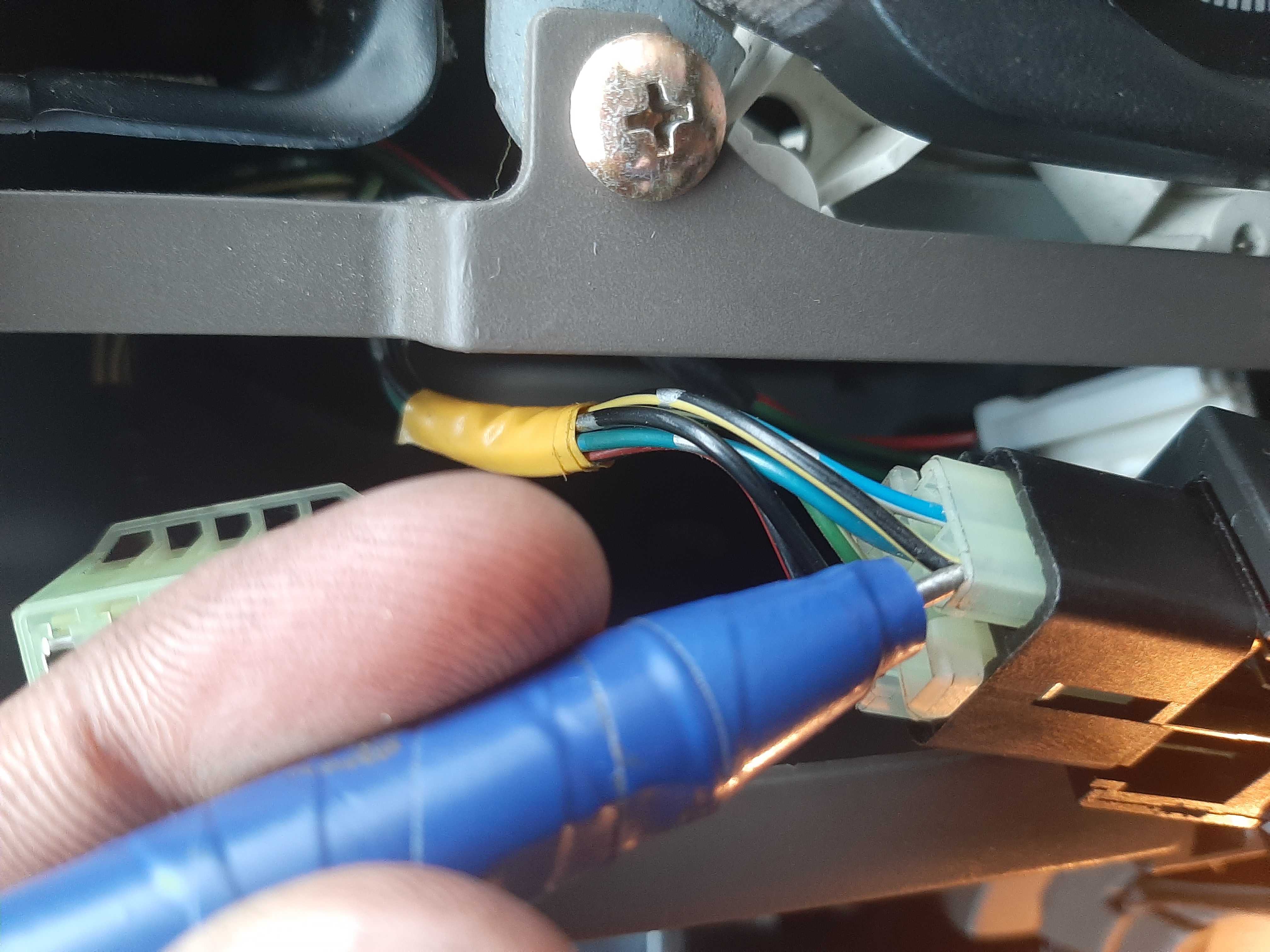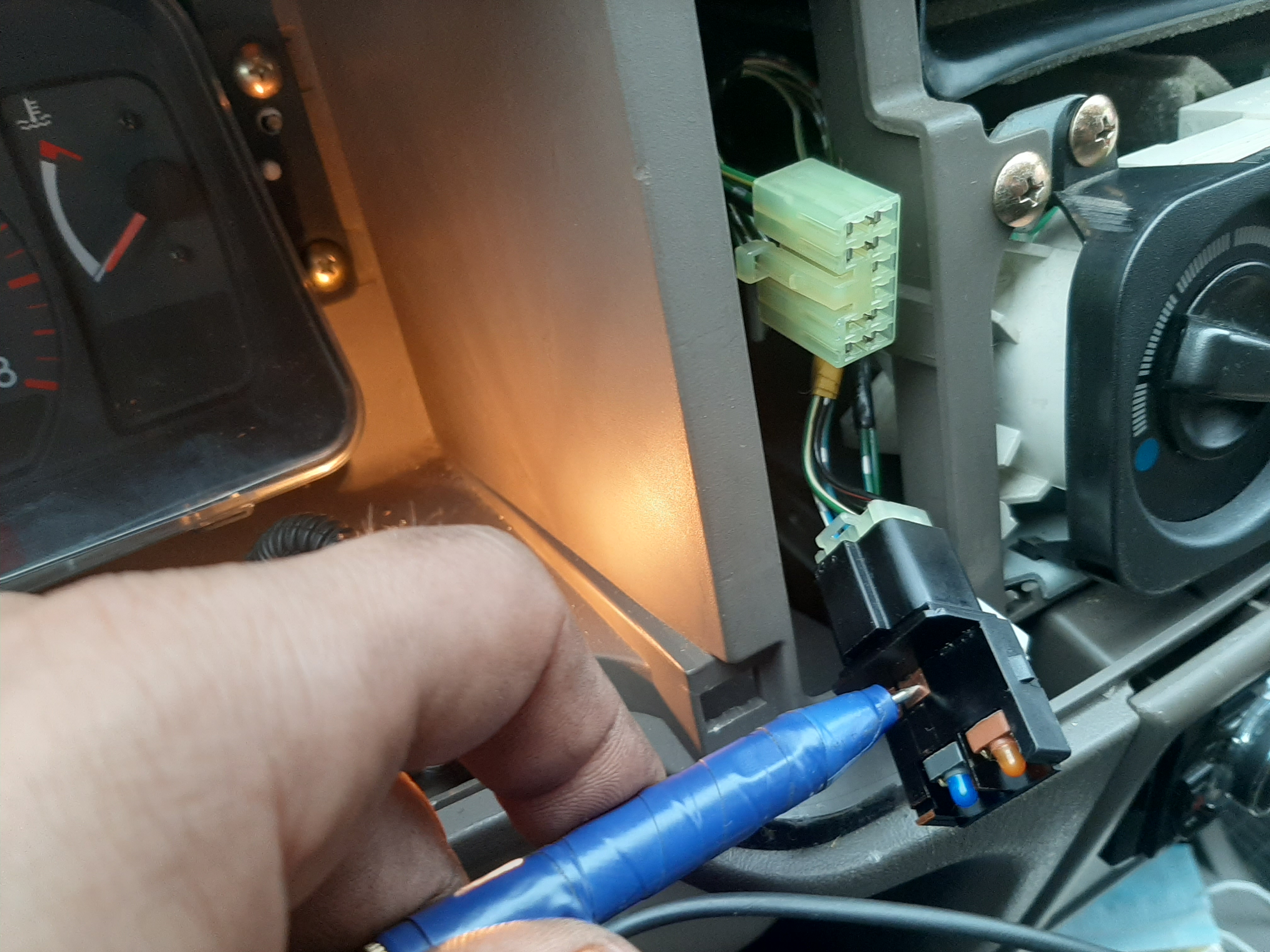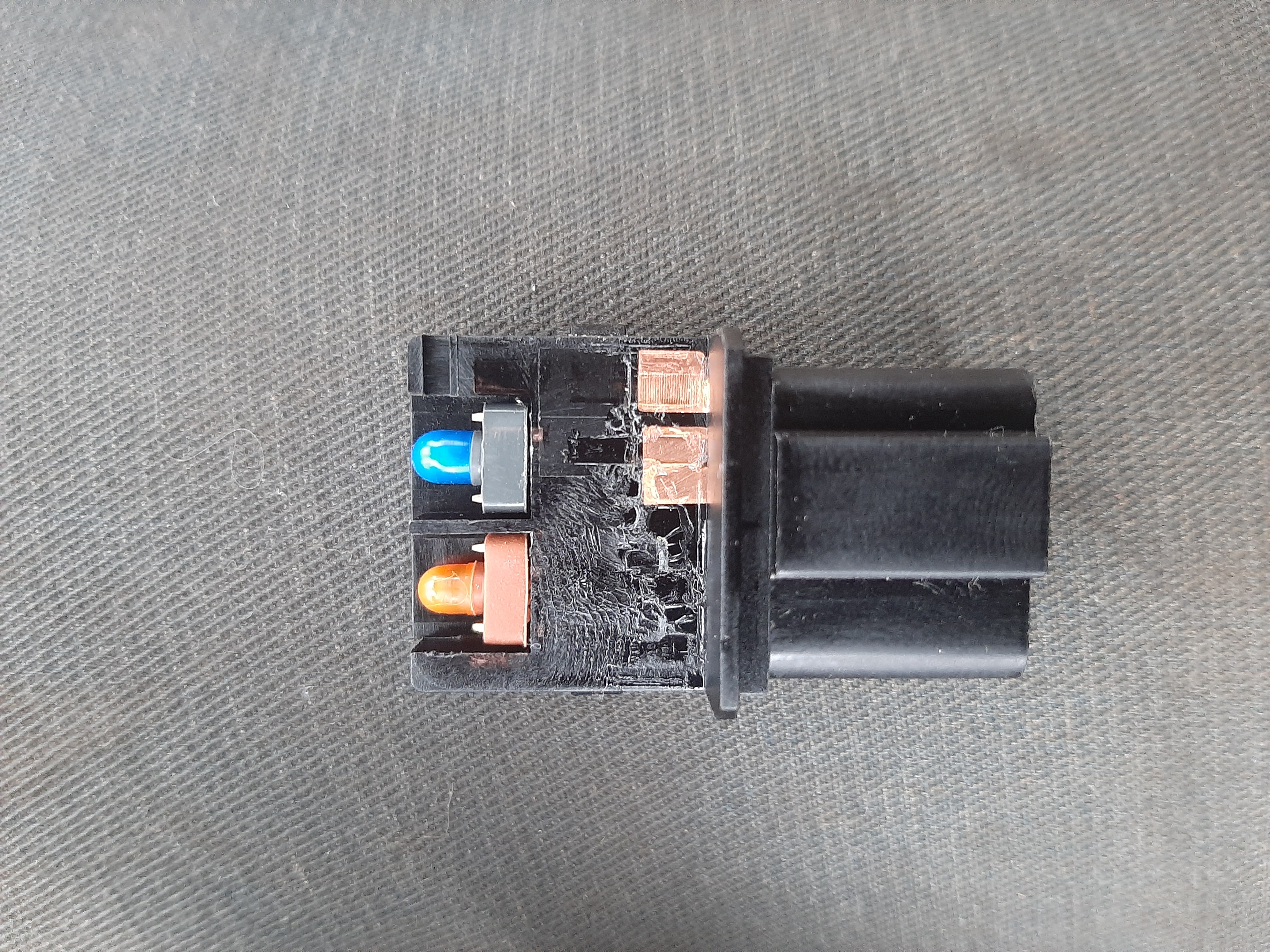 Всем добрый вечер. Сегодня добрался до подогрева зеркал. На подсветке приборов менял лампочку за одно решил проверить кнопку подогрева на наличие на неё питания. Проверил контролькой оказывается есть, три провода под напряжением. Но когда жмёш кнопку питание через кнопку не идёт. Разобрал кнопку, я впрошлый раз когда лазил в неё видимо пластину с контактами не правильно поставил. Перевернул как надо собрал обратно. Питание пошло на один провод, но всё равно было тихо, с правой стороны реле не щёлкало. Только вот что было не понятно в кнопке два диода или лампы я не знаю. В оранжевом колпачке на оба конца подаётся плюс но она не светит. На синий в обще не чиго. Я не знаю это наверно подсветка. В общем мучался я мучался понял что сам не сделаю. Собрал все до кучи поставил на место. Поехал одного члена семьи забирать с работы, как то не взначай нажал кнопку подогрева а он работает. Я в обще в ступоре. Может на не заведённом двигателе он не включается. Лазил контролькой провода проверял вот фото есть
