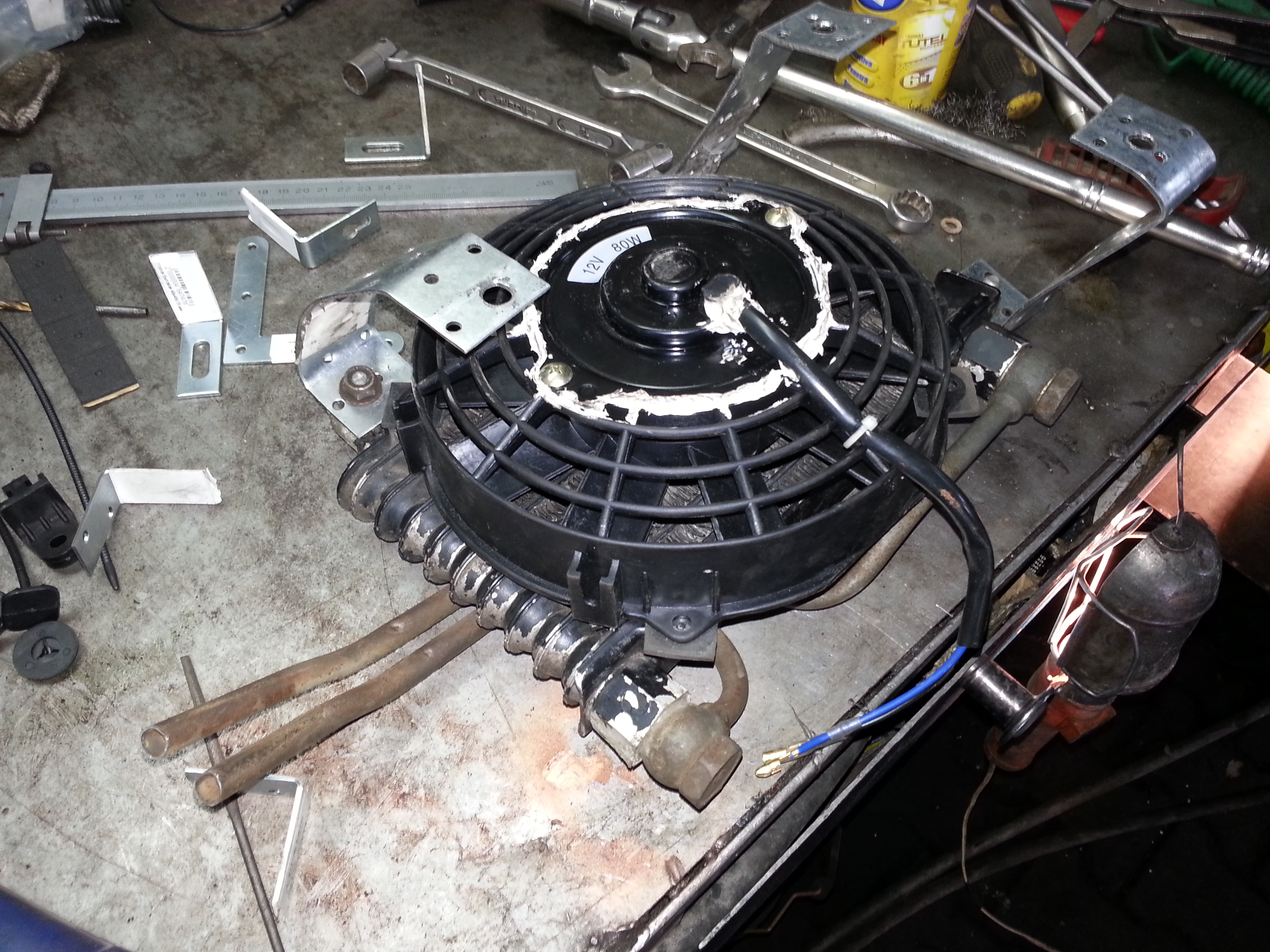 Были закуплены б/у радиатор, вроде от мицубиси сигма, вентилятор, самый маленький который нашел, термостат Derale13011, датчик-переключатель Derale 13021 Inline Fan Thermostats Kit, родные хомуты MR 133826, шланг SEMPERIT S TU40 (который не совсем подходит, буду потом менять).