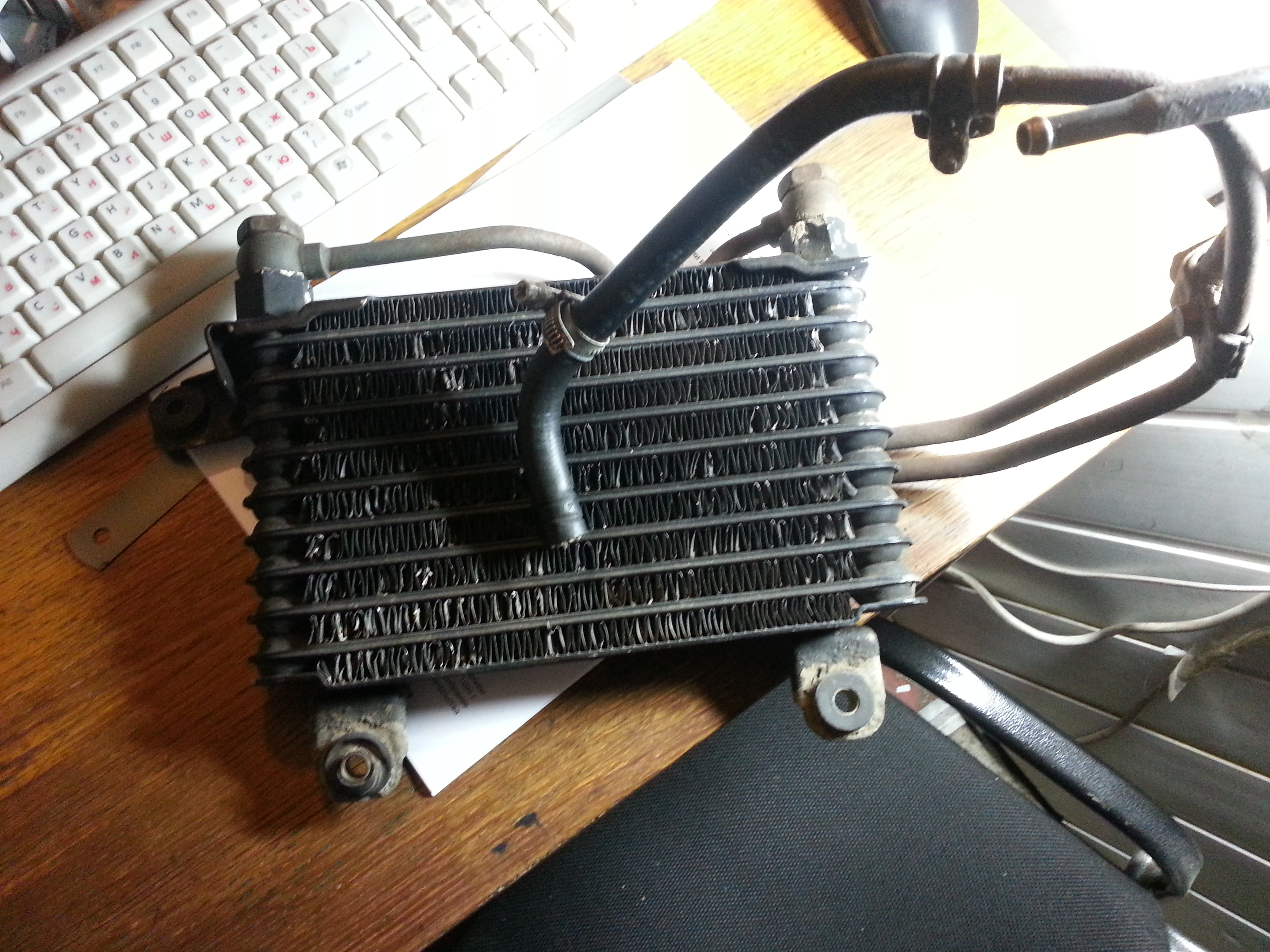 Т.к. размер дералевский 3/8 дюйма, а шланг все таки 10мм, то хомуты пришлось обжимать (уменьшать) в тисках. До этого сочилось масло из соединений … есть еще размер 1/2 дюйма, но мне кажется он большеват.