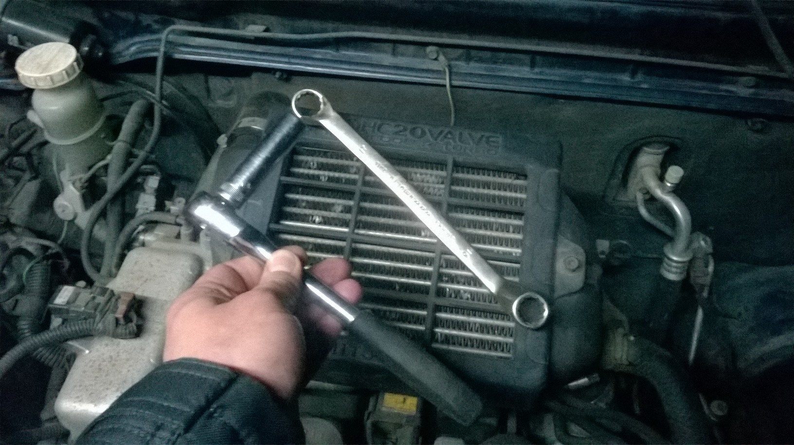 Засунул небольшой вороток с квадратом на 3/8 и удлиненной головкой на 12. В нижние отверстие очень неудобно просовывать, мешают шкивы. Ослабил ролик. Постоял 10 секунд и затянул (в общем чтобы на горячих деталях ГРМ пружина ролика приняла свое положение).