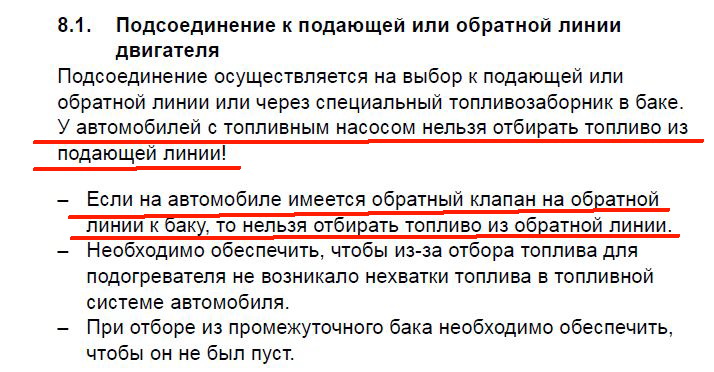 1. Установочная инструкция на Webasto Thermo Top Evo раздел 8 п.8.1. гласит: «в автомобиле с топливным насосом нельзя отбирать топливо из подающей линии!» Смысл этого запрещения мне разъяснили так: «топливный насос в баке создает давление, значительно превышающее то, на что рассчитан котел, то есть, его будет просто заливать. Разница в давлении топливного насоса автомобиля и Webasto примерно в 10 раз.