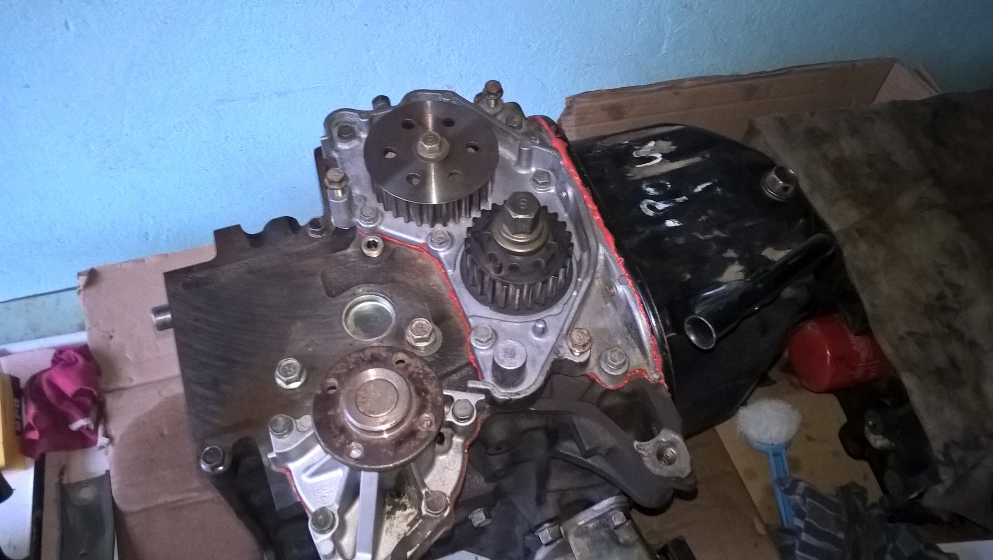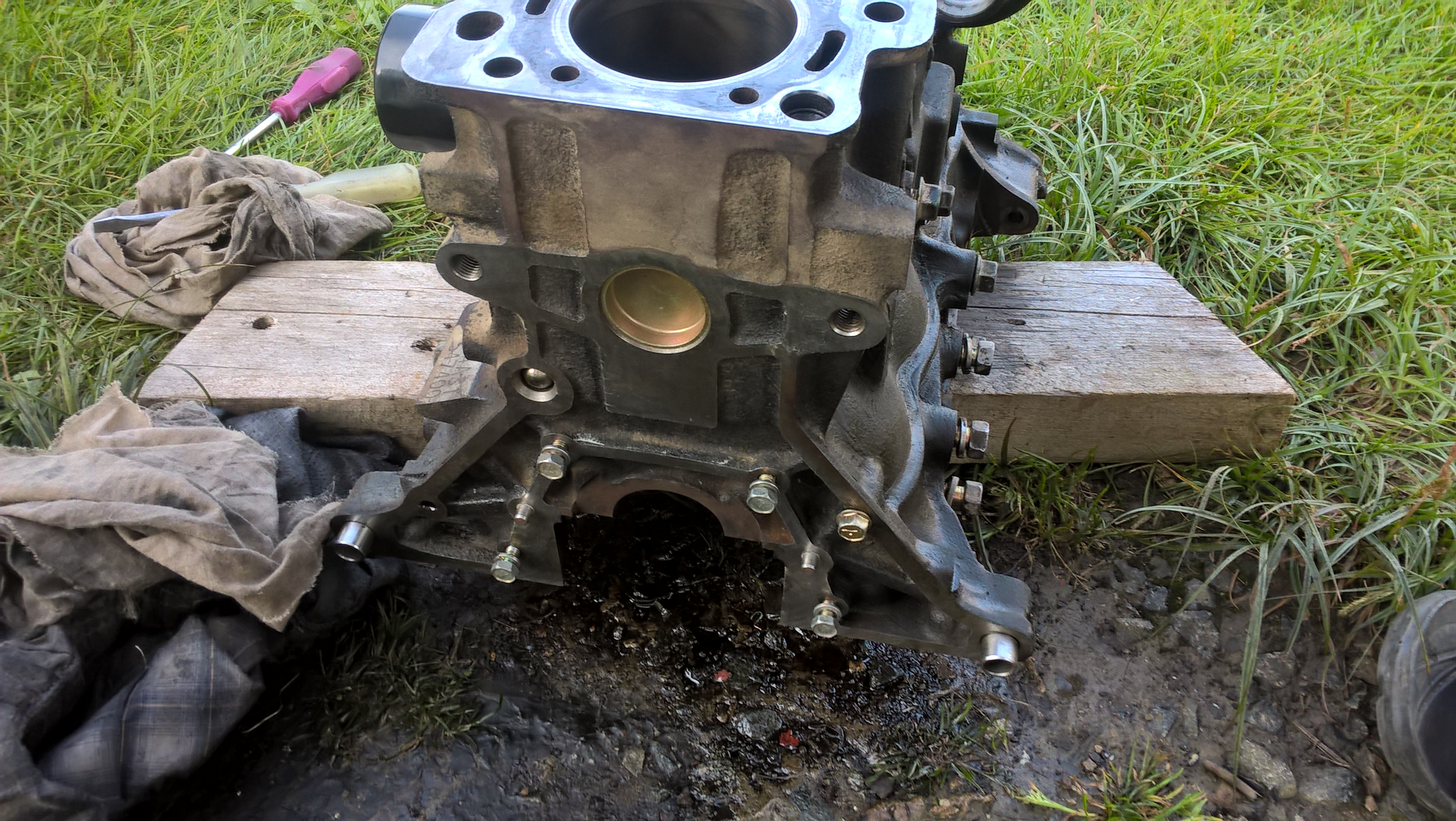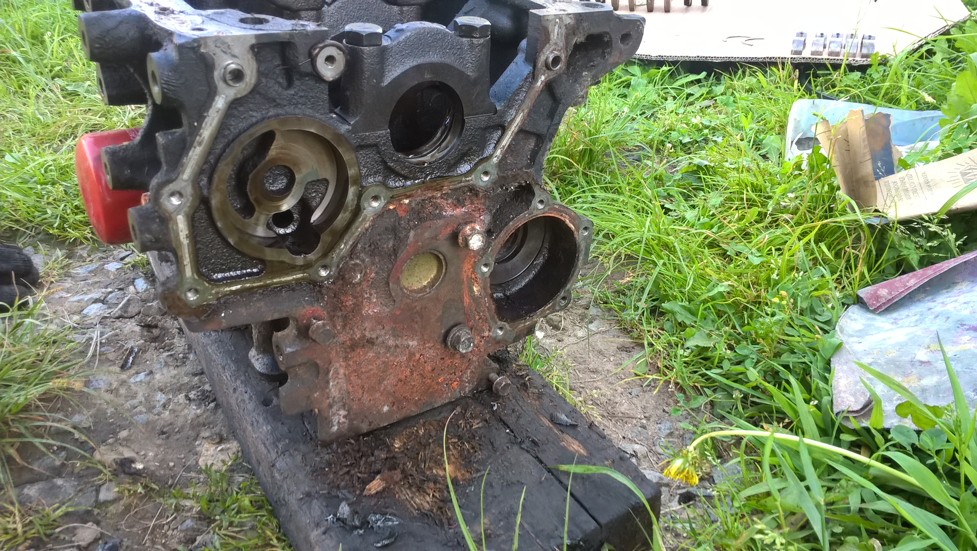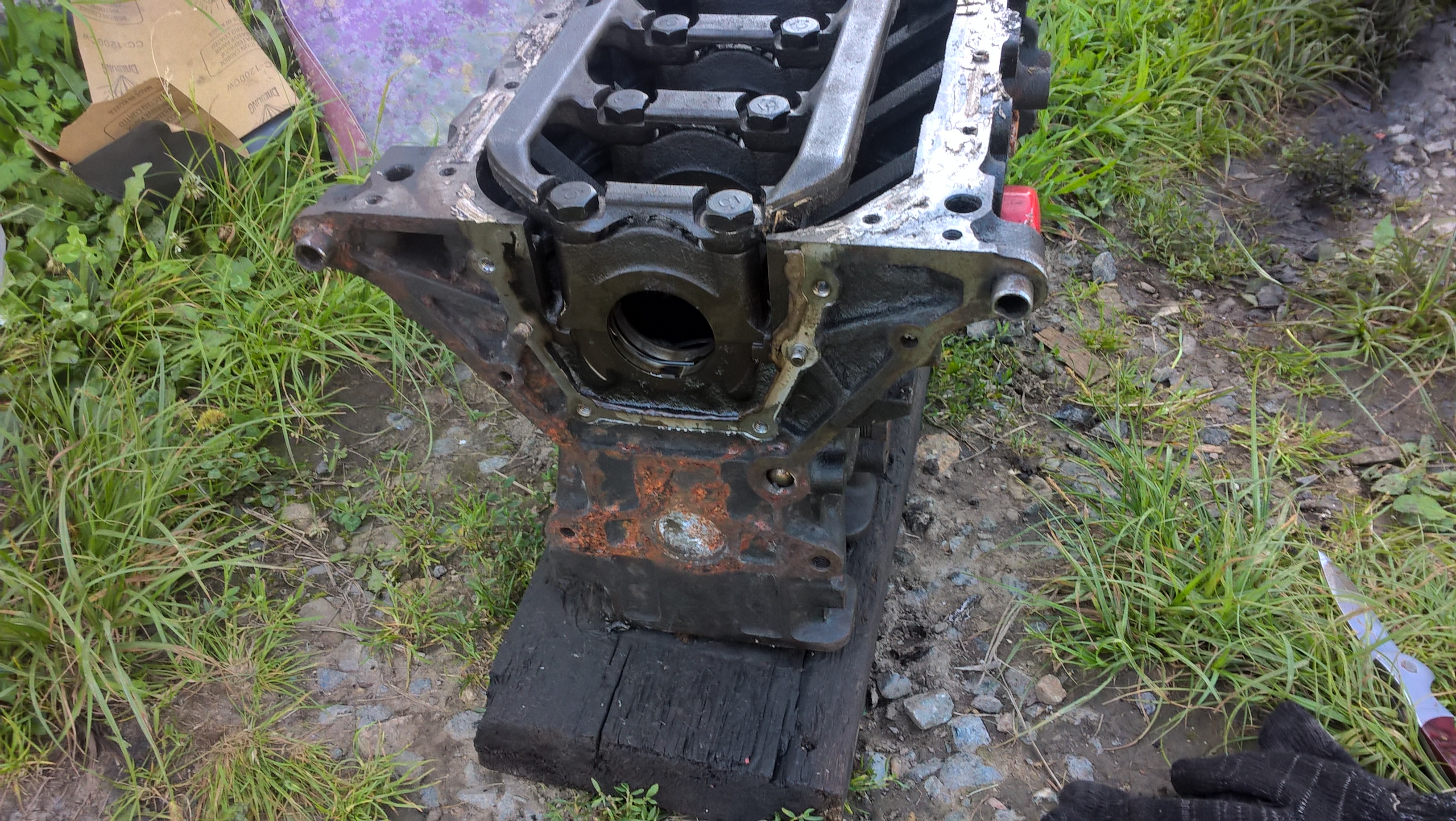 Теперь остался блок, который неудавшийся донор. С убитым коленом, кто-то его уже перебирал кривовато, поддон на белом герметике поверх старого красного, болты были перетянуты. Есть мысли восстановить хвостовик КВ, шестерню и шкив (в качестве эксперимента) и собрать его на тест. Не совсем комплектный был мотор, нет впускного коллектора, стартера и маховика (что наверное плюс, возьму под него МКПП в сборе)