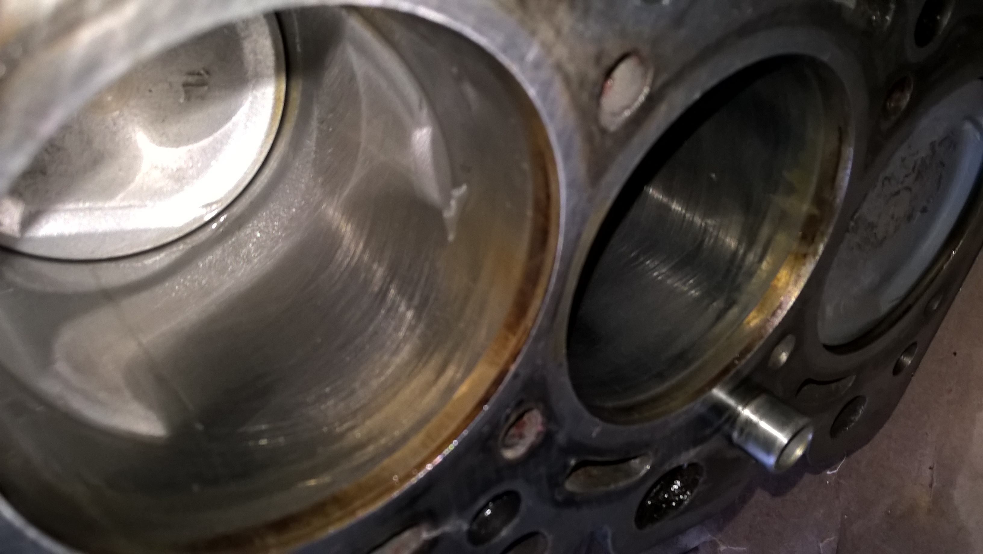 После 200ткм цилиндры в отличном состоянии, хон есть задиров нет, на поршнях есть потертости, но в цилиндры садятся плотно. Родные кольца имели зазор в рабочей зоне примерно 0,55мм, новые 0,20.