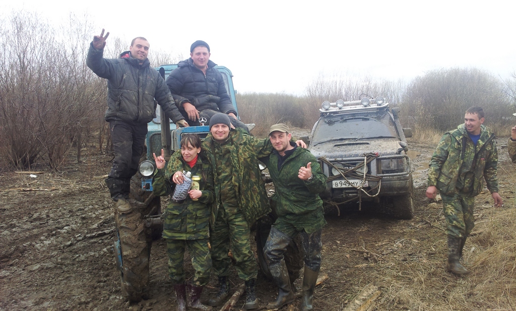 Сначало зацепили за дугу так как крюк был в грязи утоплен.......(сказали да потихой выдержит) тянули метров полтора....БАХ нахрен дуга отлетлетела,и кстати не с креплений а просто дуги лопнули....Хрен сними подумал я, главное выехать.......и далее......Еле еле откапываясь вгрязи лопатой и толкая Деликой - выехли.
