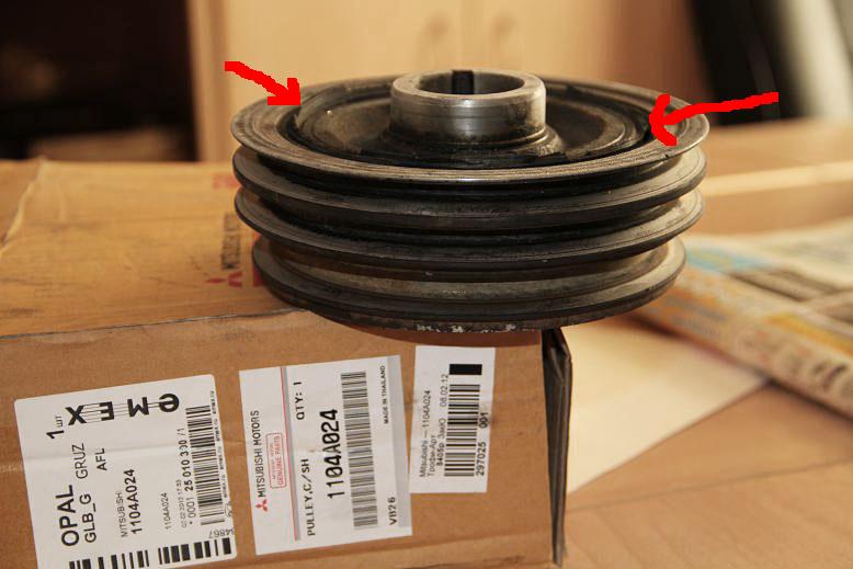 поменяли. вот шкив снятый. с демпфера слетел, точил блок и к тому же шкив прокручивался.... посадил батареи... красным показано на сколько. но на самом деле двигается около 1 см