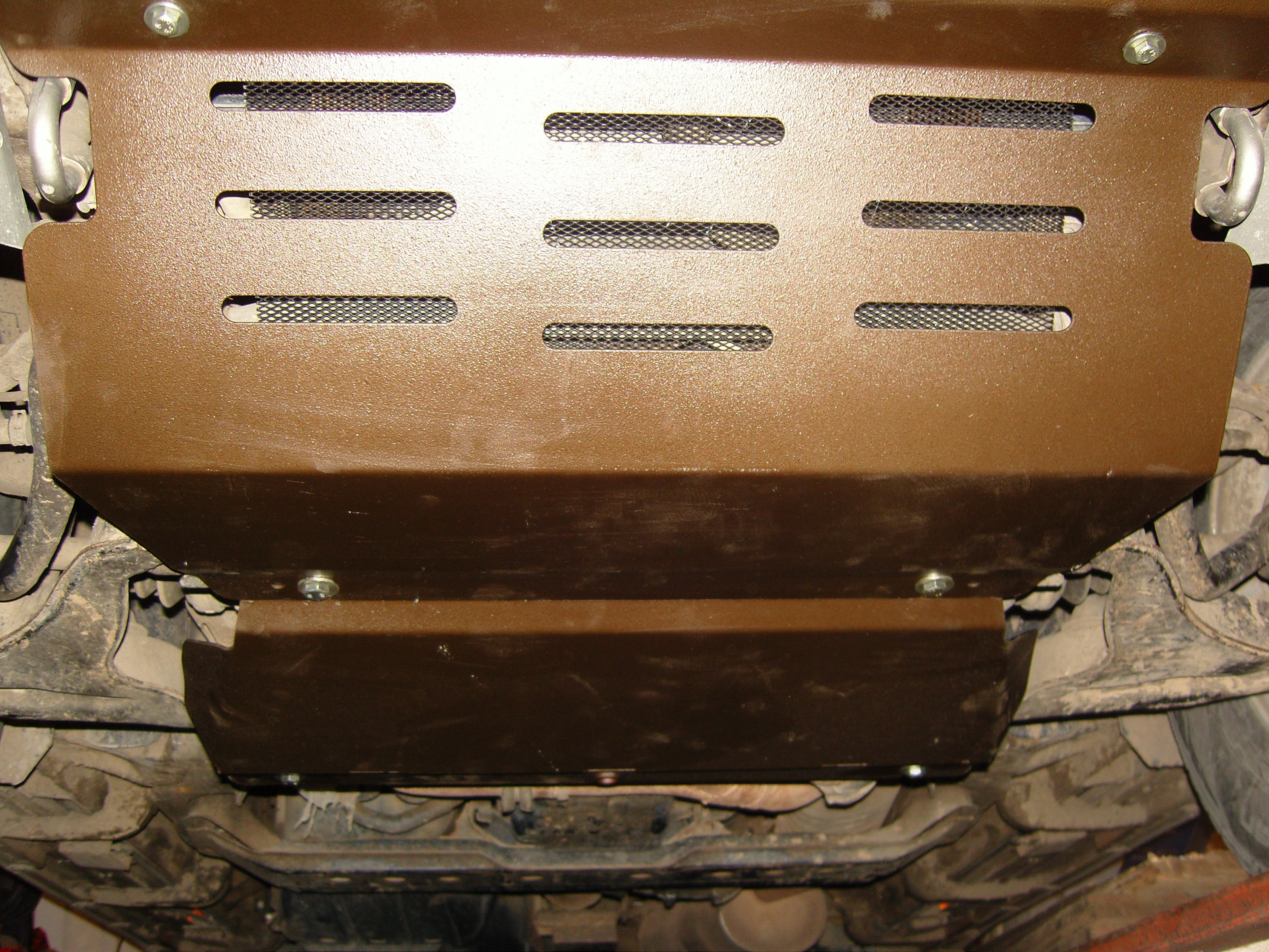 Вот так выглядит Динитрол 4942.Сеточку еще на термоклей пришпандорил,поглядим как держаться будет.Чтоб бампер не натирало закрепил через штатные цилиндрические проставки.Виталь,а твоя защита картера прям в штатные места крепится?Просвет съедает?Моя слопала 1.5-2 см.