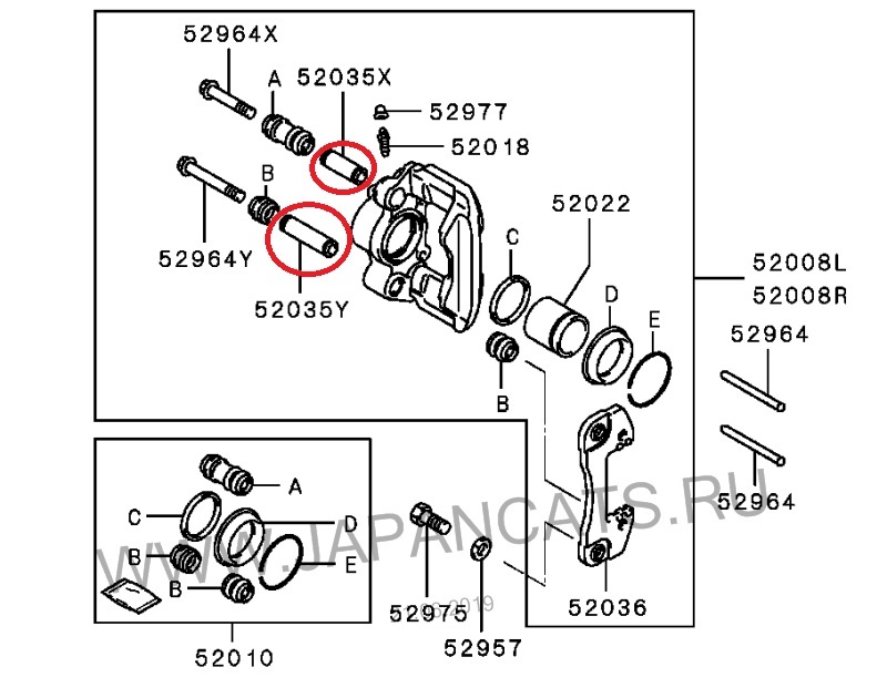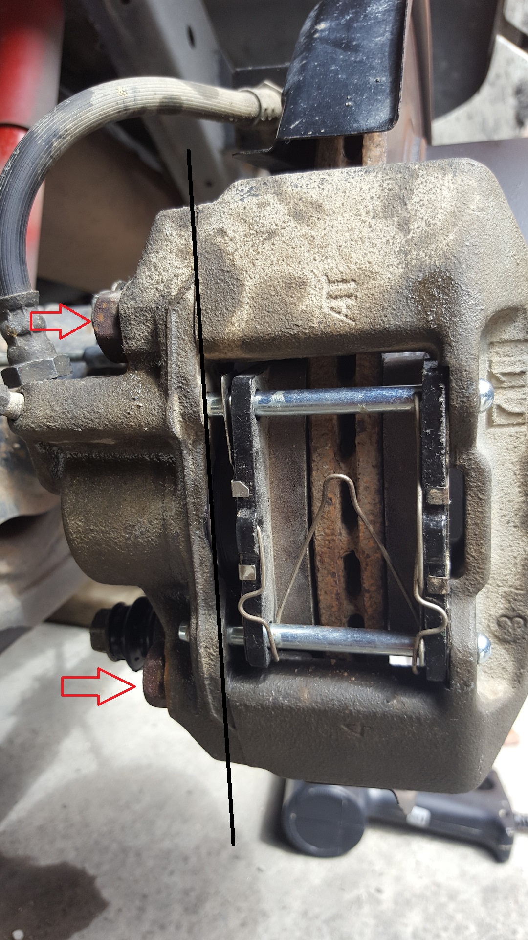 Отворачиваем болты указанные красными стрелками и суппорт половинится по черной линии.