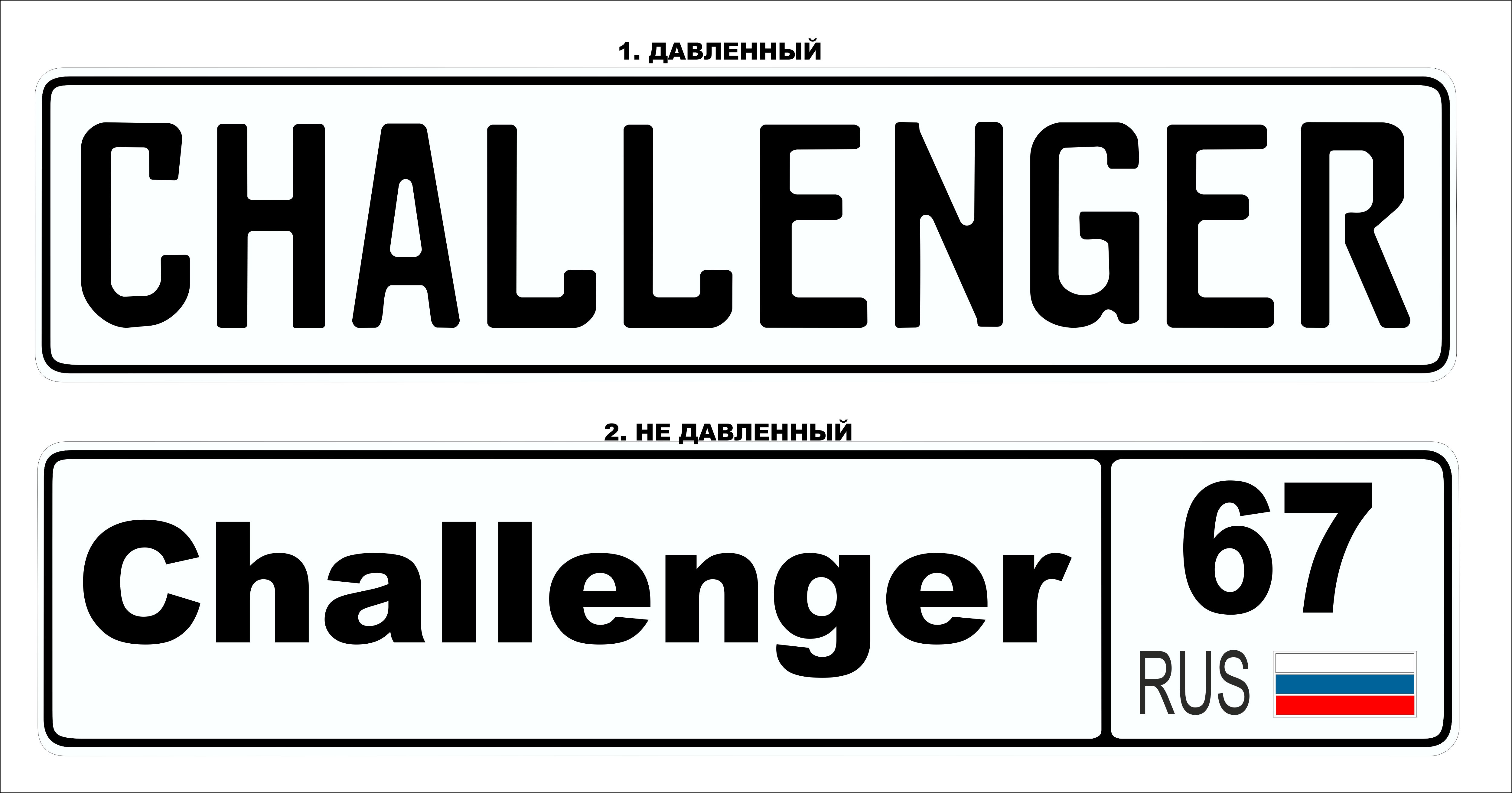 тогда мне давленый без кодаВредная писал(а):Во втором варианте можно все, т.к это НЕ давка а просто так сказать наклейка. Чтоб надавить, надо сделать матрицу из двух частей, в виде букв, из металла. Это стоит очень дорого - чуть не 25 за каждую.... оно того не стоит, поверь, а то мне то что?challenger писал(а): Скажи, а можно ли в варианте 2 шрифт увеличить вверх, чтоб пропорционально было?