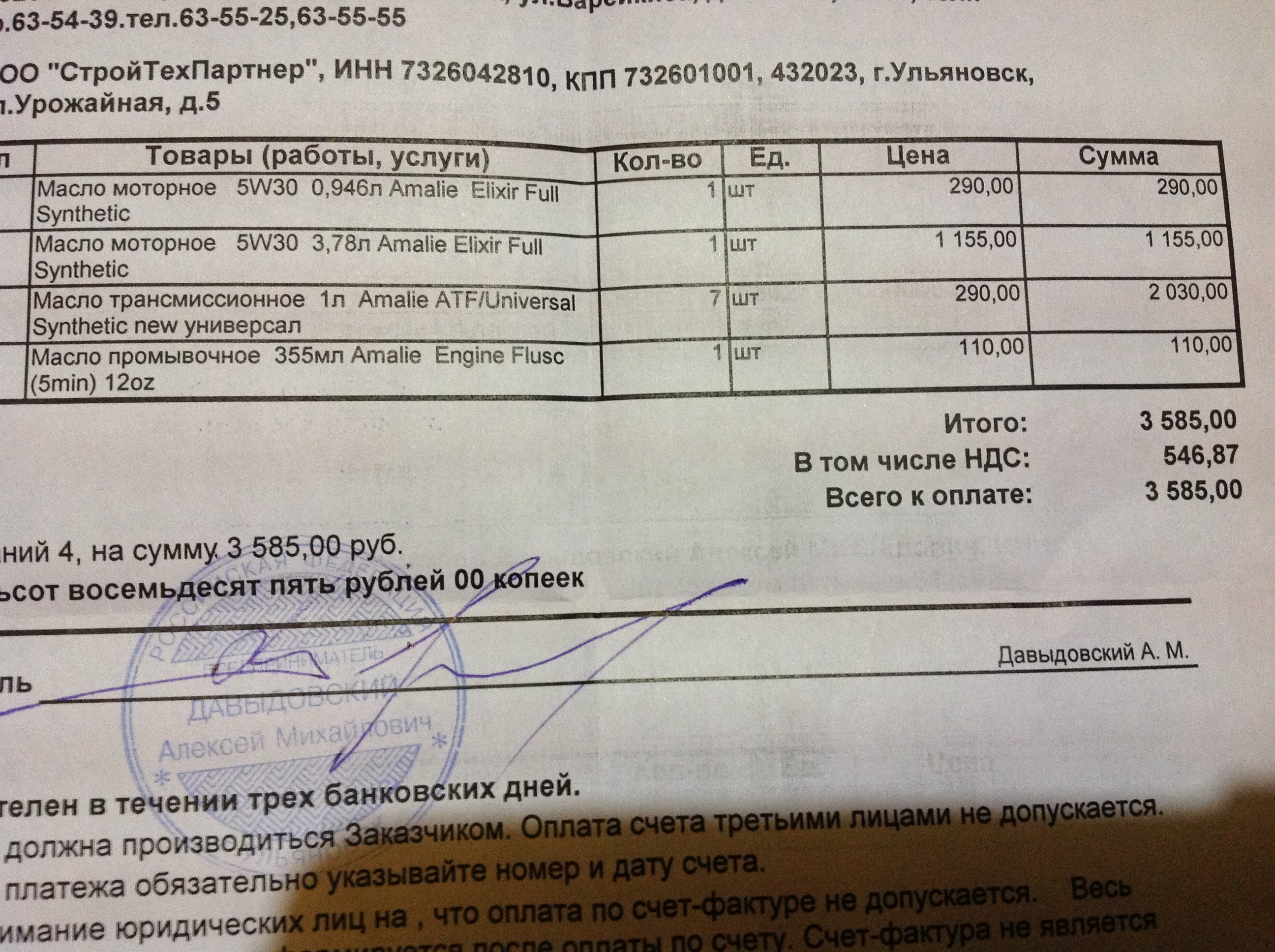 Беру счет на оплату. И забираю масла (без оплаты, т.к. 100% доверяют и знают что оплачу).