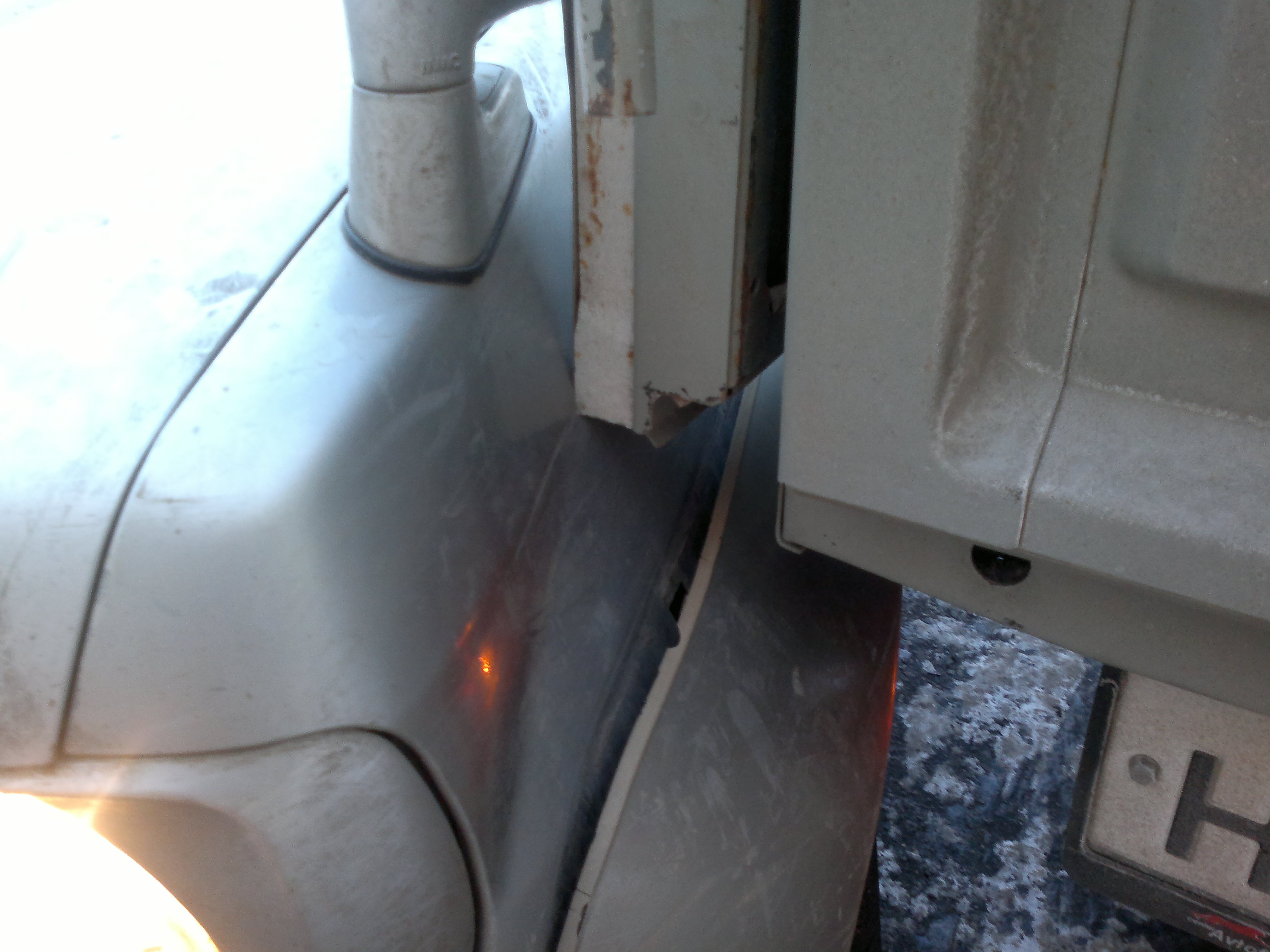 самым углом почти прокол и деформация, и еще видно что от нижнего пластикового бампера отошло на несколько сантиметров внутрь, возможны внутренние повреждения