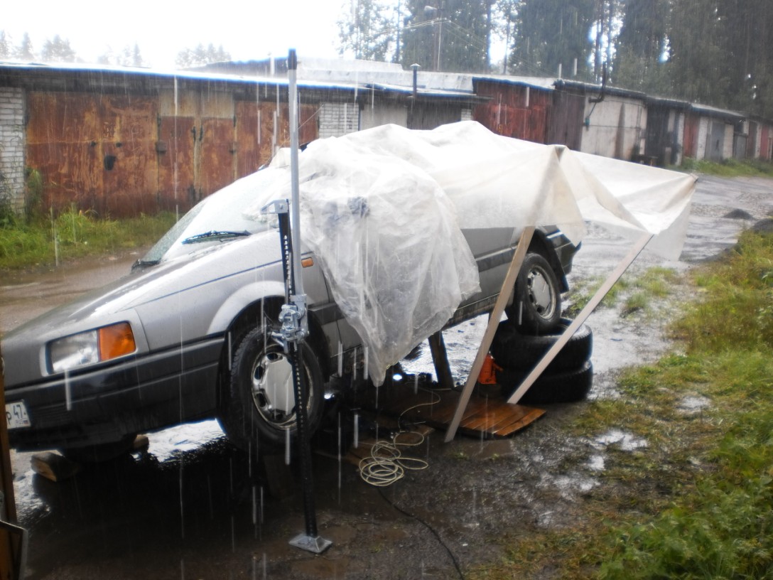 Машину на передачу, а сам упёрся как следует в стойку. Грунт проможен, не закопается. Думаю, толкну и пойдет. Она вроде пошла и...