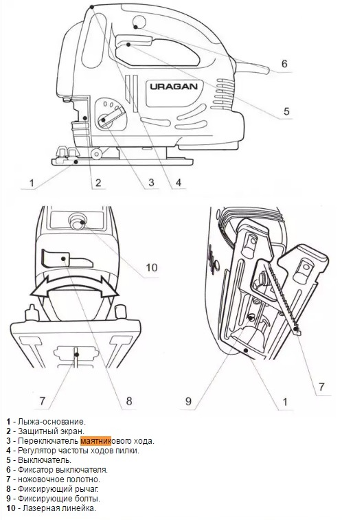 на рисунке рукоятка 3 включает и изменяет амплитуду маятникового хода пилки. частота маятника не регулируется и жестко связано со скоростью вертикального хода пилки ( чем быстрее жужжит лобзик- тем чаще ход пилки вниз-вверх и чаще маятниковые колебания)