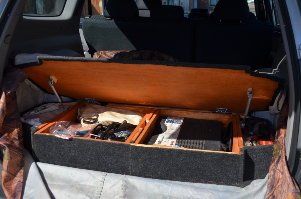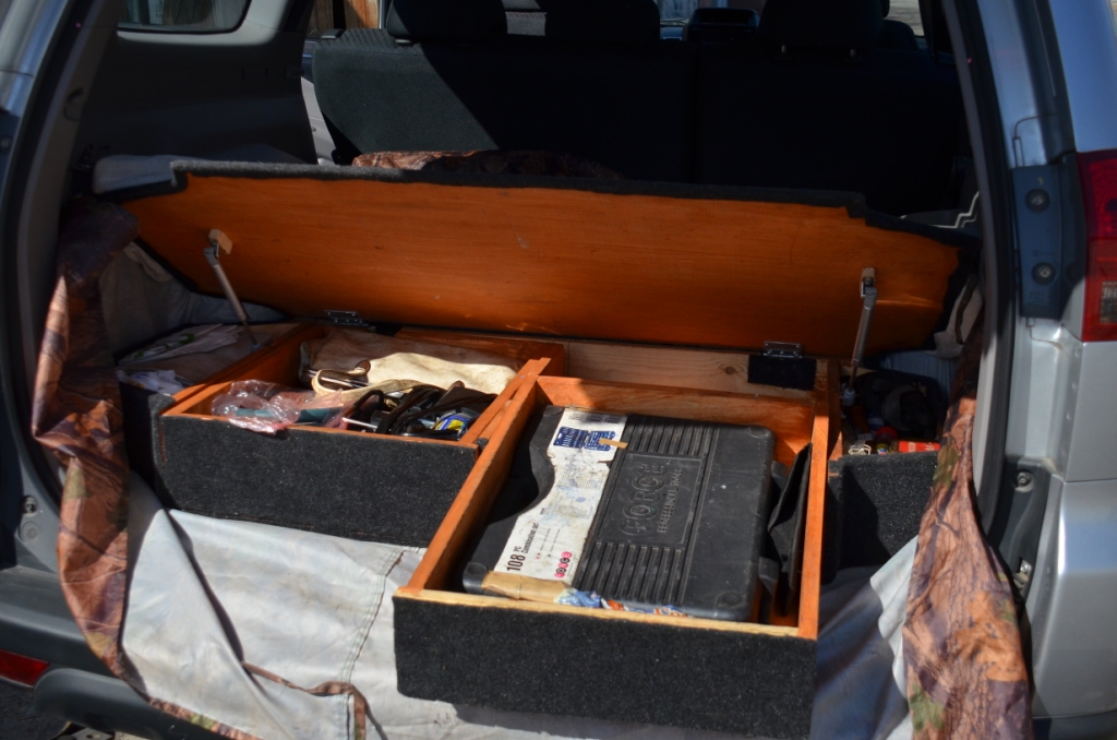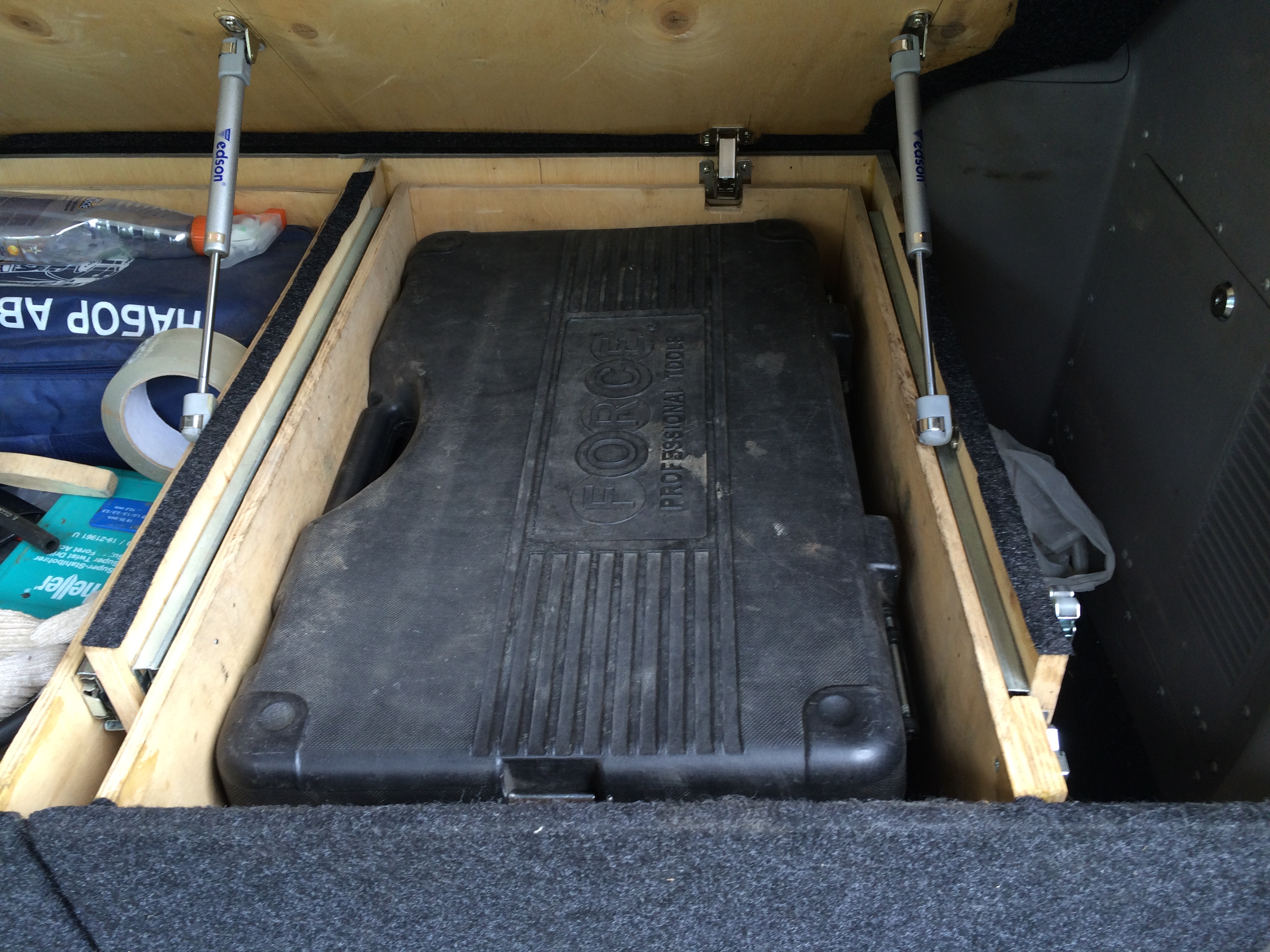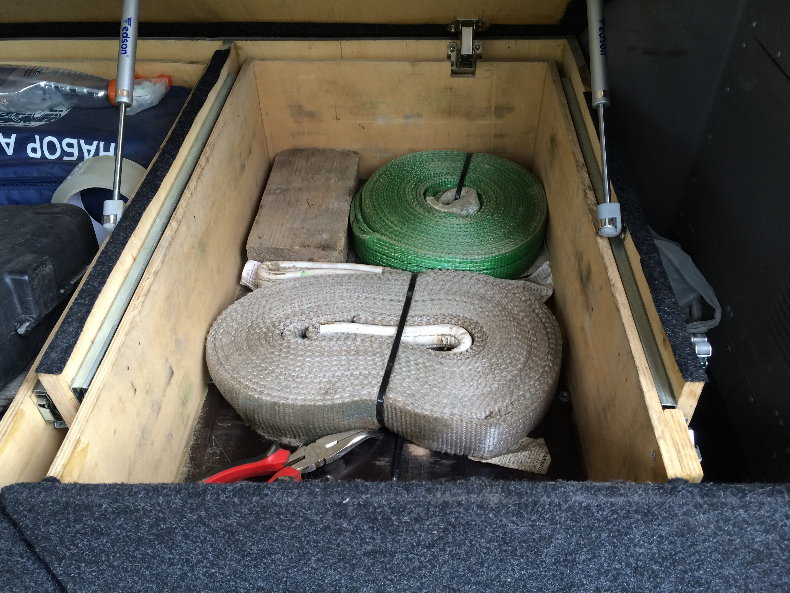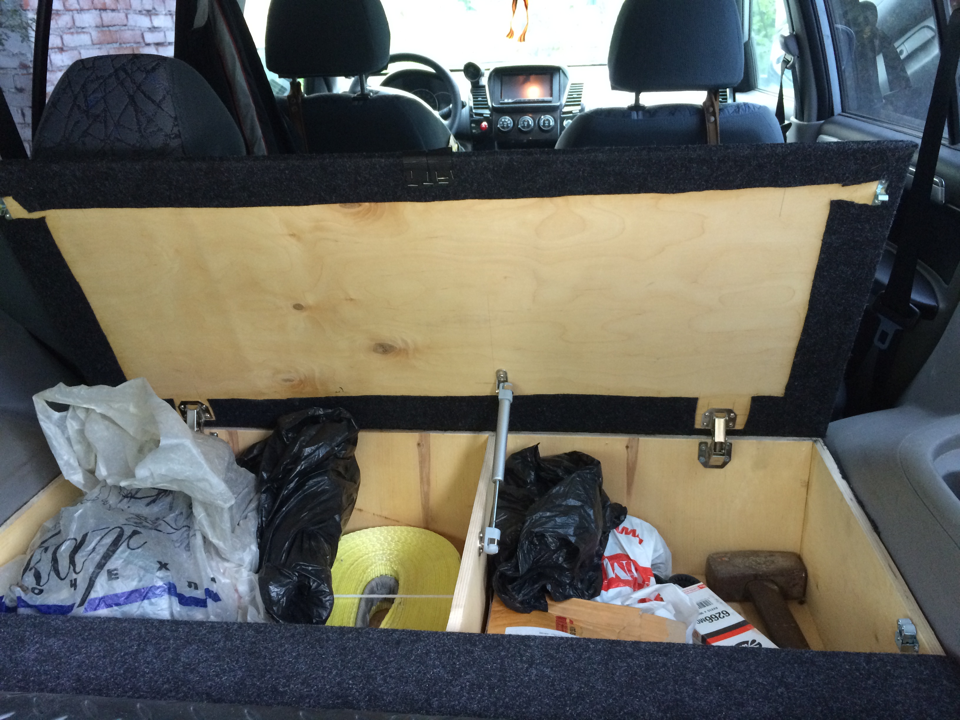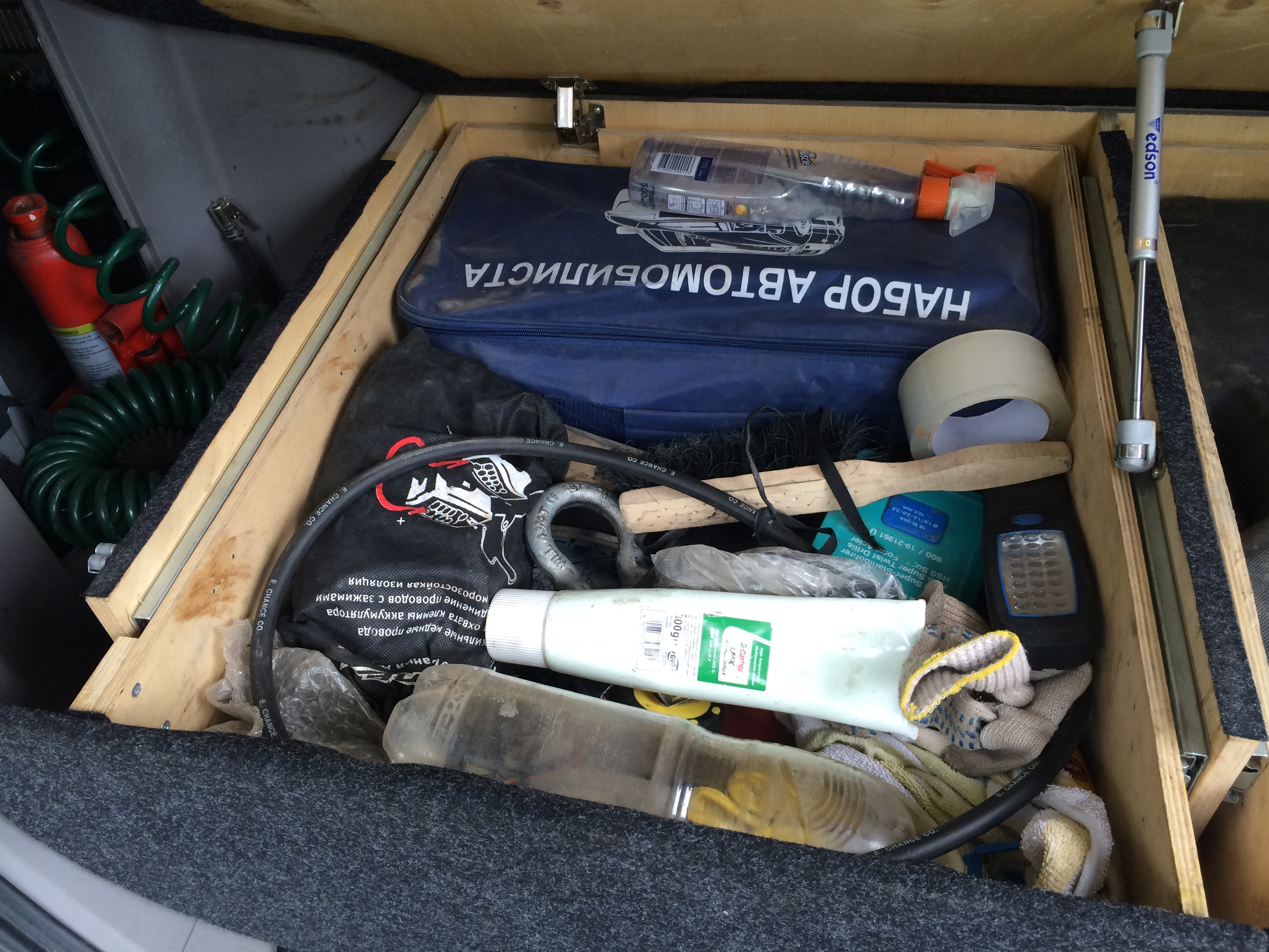 Это все в ящиках, а так в машине много всего. Сумка с разнобойным инструментом, мешочек с гайкамишайбамиболтамихомутами, нож, фонари, лампочки разных форматов, предохранители....