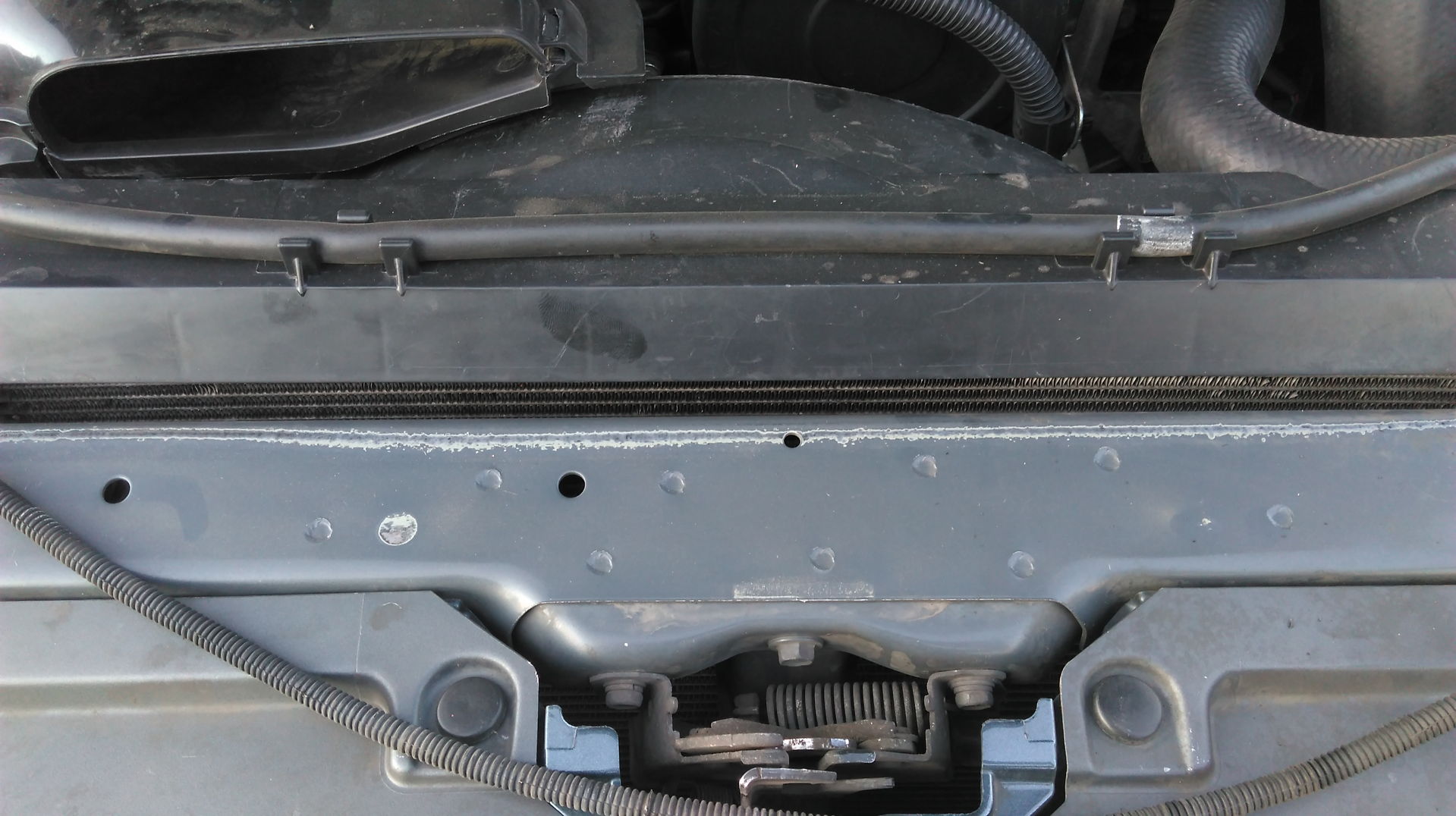При осмотре верхний патрубок радиатора был пустой, в расширительном бачке ничего уже не было. Открутили два болта, вопреки его возражениям на громких тонах. Потом пауза, дали щётку, кёрхер. И он сам, бесплатно для себя, снял свой перегрев.