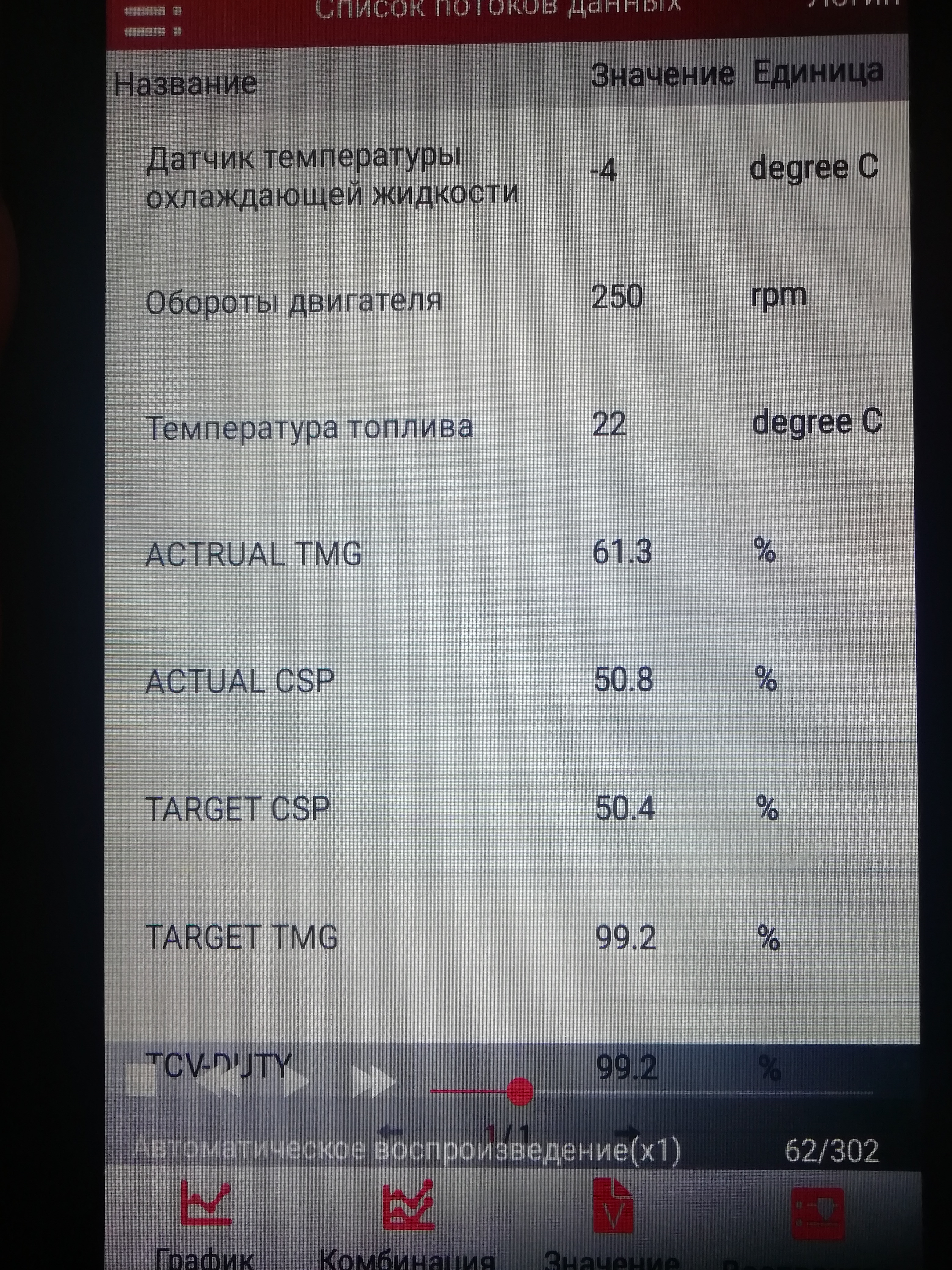 При кручении стартером почему то температура ОЖ падает до -10, показатели CSP выравниваются до 50%, актуальный TMG идет вверх около 50%, а заданный не меняется как был 99,2% так и остался..