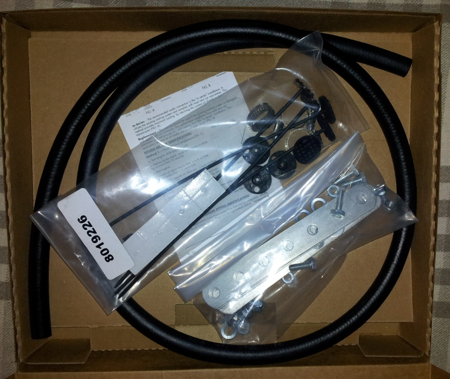 Приходит вот такая коробка Made in Korea. В ней, кроме радиатора, ещё шланг и крепления. Комплектный шланг использовать не стал, заказывал отдельно.