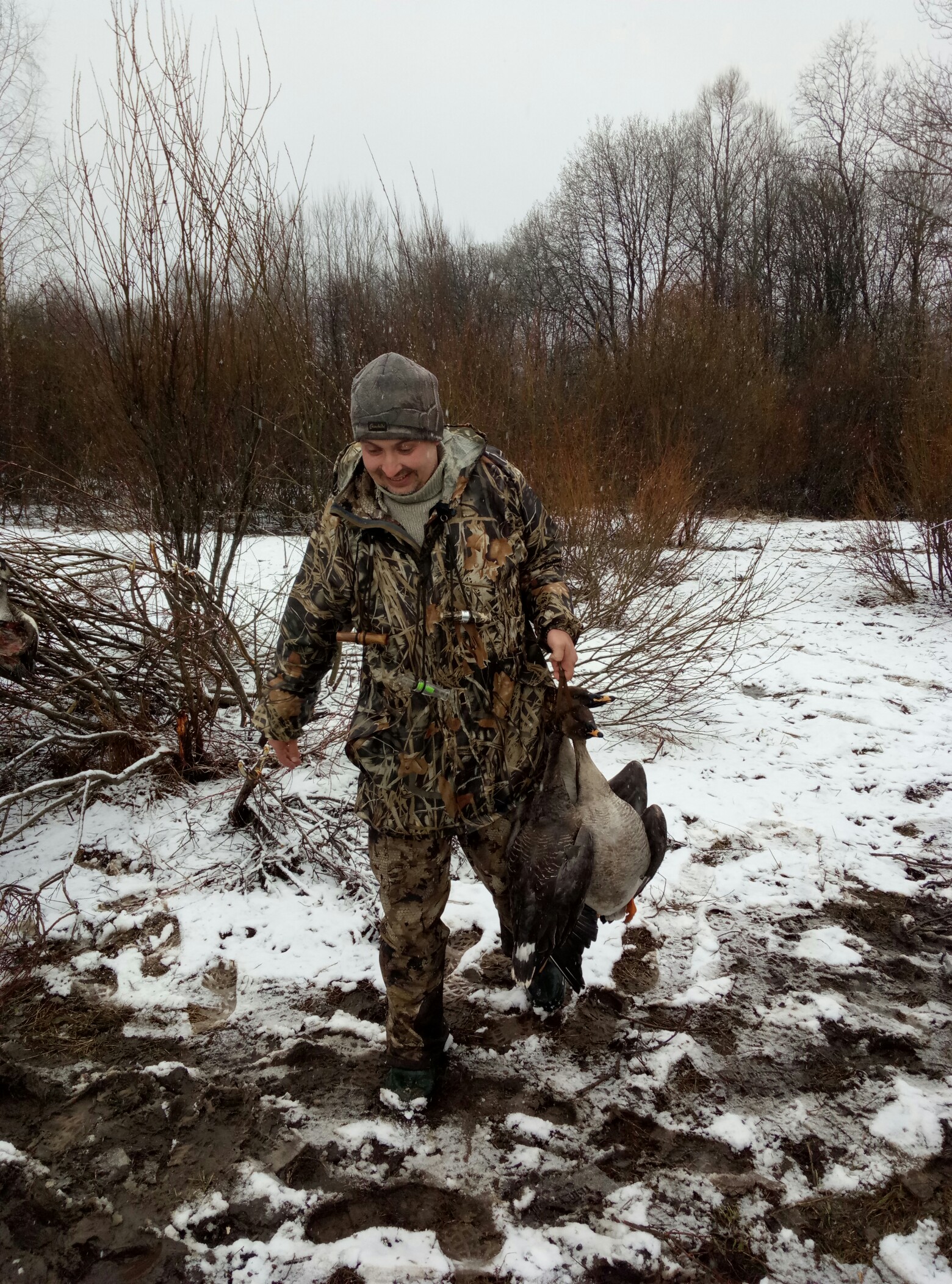 А у нас снег валил на открытие. Впервые с чучал снег стряхивал по 3 раза за зорьку, а потом морозец всё озеро заморозил, так же приходилось ледоколом работать, обходить чучалки и выламывать из льда.