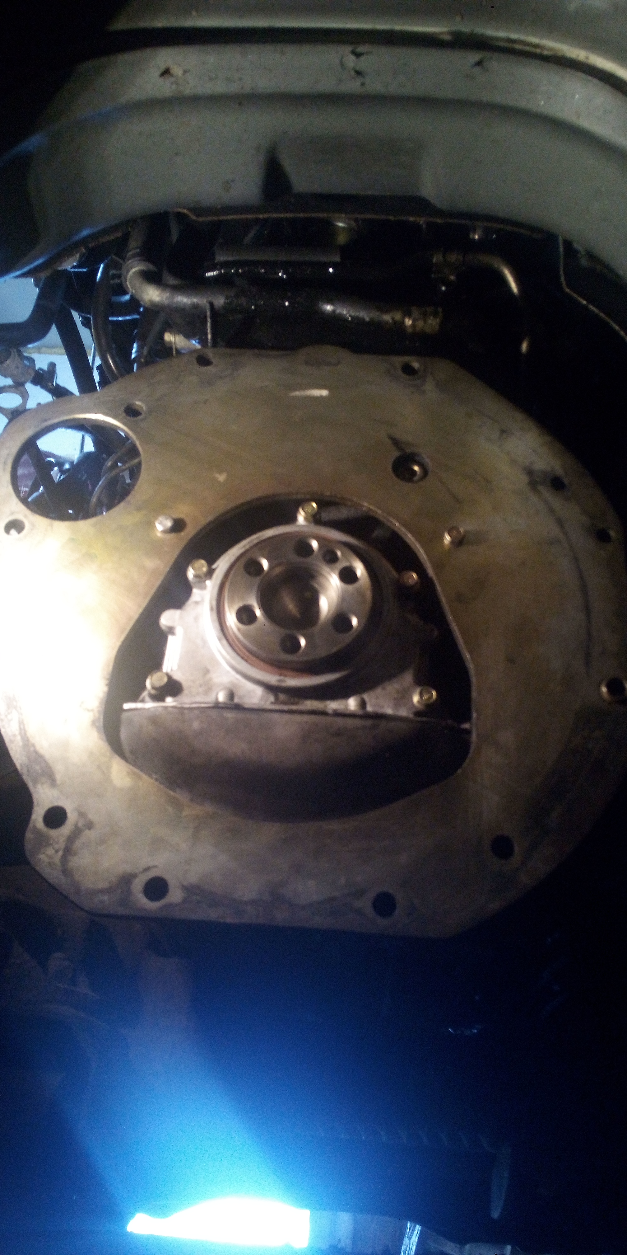 Сняли. Надеюсь, коленвал не потянули, но ещё не стал сильно затягивать. Посмотрел по фазе от сальника, вроде на месте.