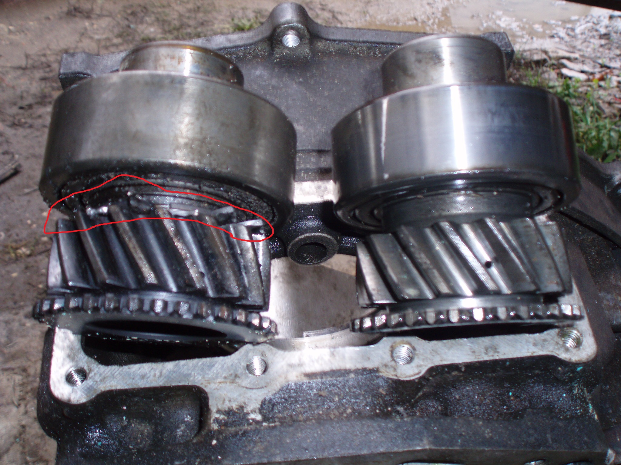 В общем вскрытие показало, как Я уже писал, слизана шестерня понижайки. Все думал как это могло случиться. В общем стопор оси этой понижайки был установлен не правильно (не стопорил), ось сдвинулась и под углом шестерню слизало, хотя может это уже следствие (просто когда разбирал, ось была выдвинута на половину). Ну это уже не важно. Самое плохое, что разбило посадочное место (где шайба), немного задрало другие шестерни и как то странно вращался подшипник на основном валу. В общем переставил всю переднюю часть от валявшейся в гараже контрактной (от автомата). Также заменил хвостовик, там втулка получше. Цепь к сожалению подрастянута, новую брать не хочу, пока эта пусть походит (на красного тоже ставил почти такую, уже 3 года на 35 тапках - полет нормальный). Осталось посадить все на герметик и поставить назад.