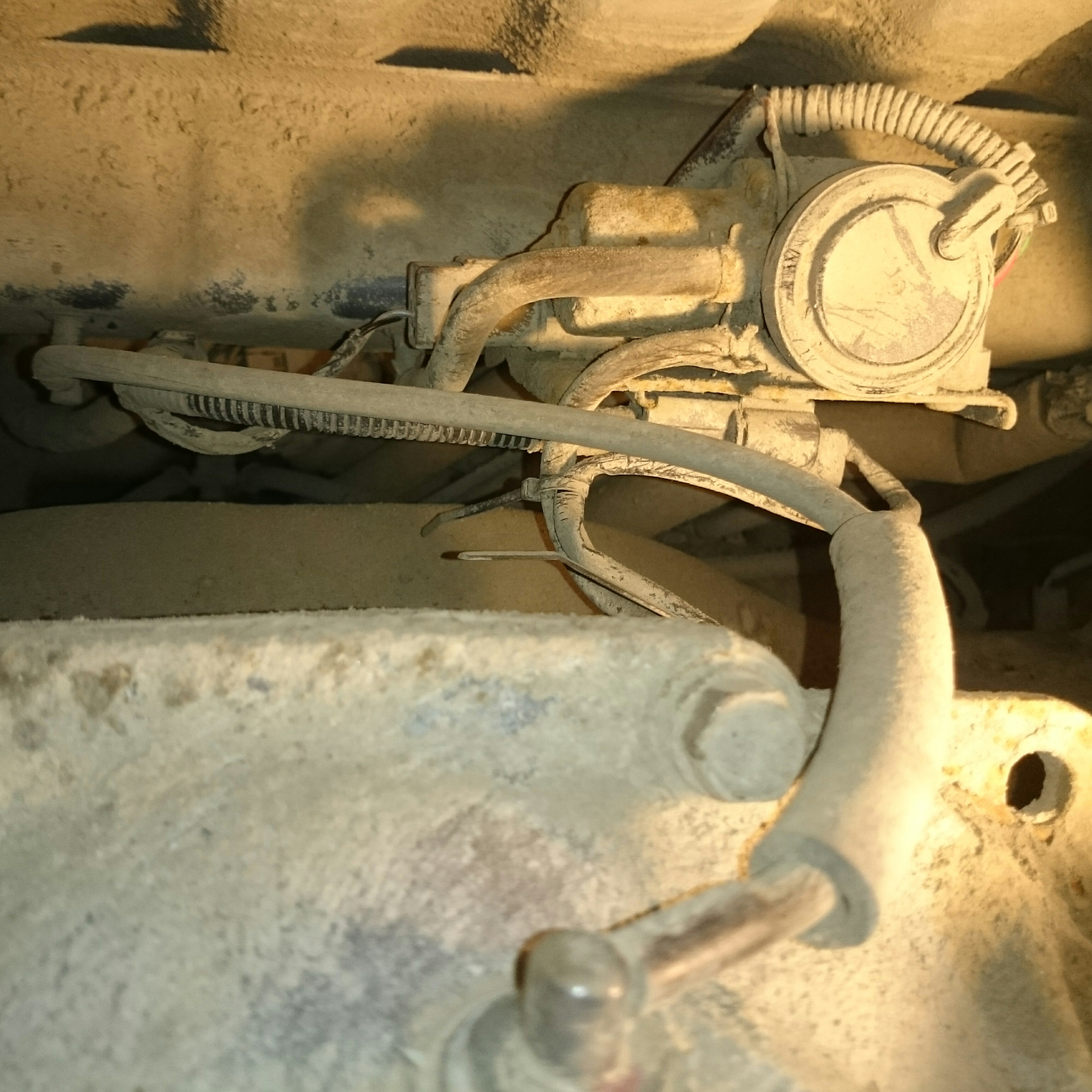 Верхний шланг проходит через траверсу кузова в редуктор, нижний тож в редуктор,рядом с датчиком