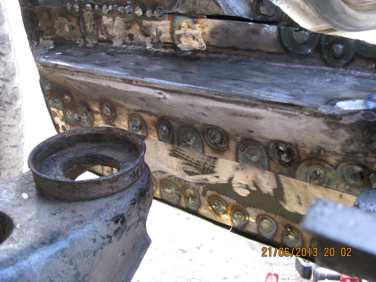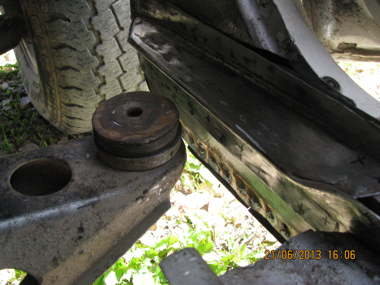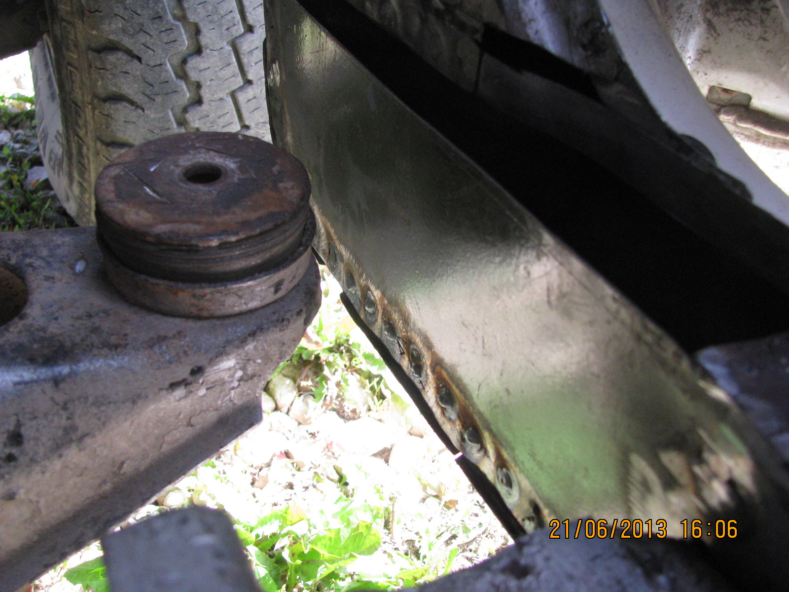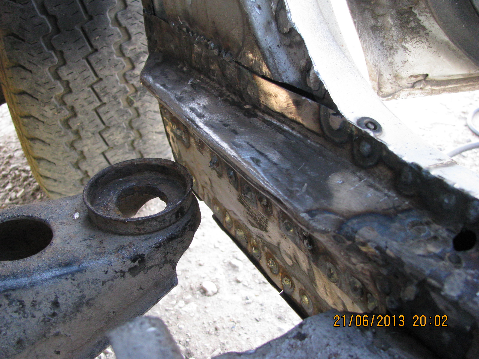 покуда фото того что сделал. кстати у меня уже появилась трещина в передней стойки в районе крепления её к кузову. и всё оттого что погнила опора кузова в полу внизу. последние пару дней были характерные звуки треснувшего металла. после того как сделал то что на фото и приварил, звуки почти исчезли, из чего я сделал вывод что восстановив это место я его укрепил.