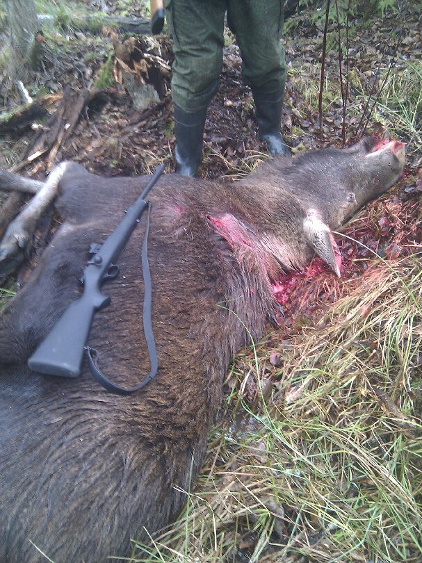 А попал я по месту - лопатка. И вставал он после первого выстрела, а не " после двух". Второй делал когда понял, что будет пытаться вставать. Да будет тебе известно, что лось с пробитым сердцем может довольно-таки далеко уйти...