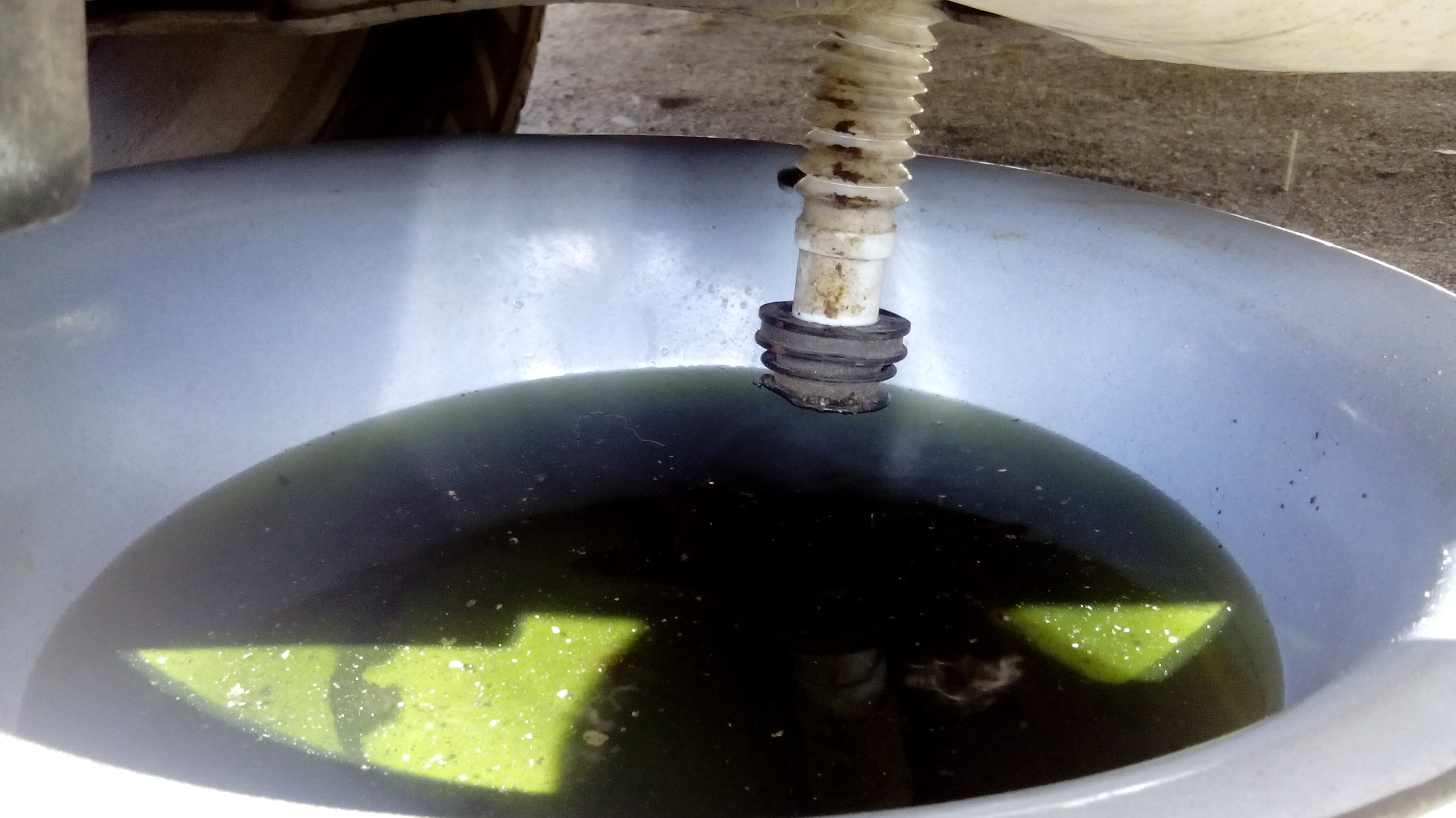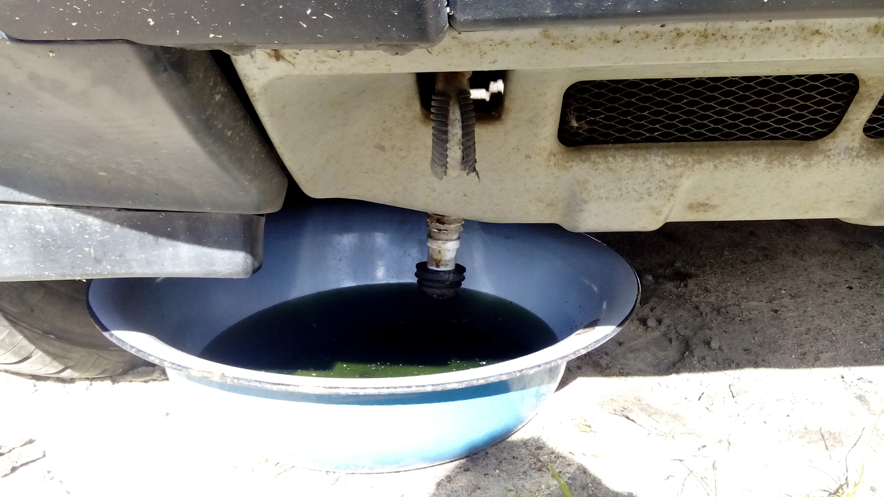 4. Снял правый аккумулятор вместе с нижним поддоном аккумулятора, снял полностью воздушный фильтр, снял кожух турбины ( 3 болтика). И вот за турбиной, на корпусе масляного холодильника есть пробка для слива жидкости с двигателя, под небольшим углом вниз. Нужен ключ: или звёздочка на 12 или головка на 12 с короткой трещоткой. Пробка отдаётся легко. Подставил воронку с трубкой и слил всю жидкость с двигателя примерно 4 литра.