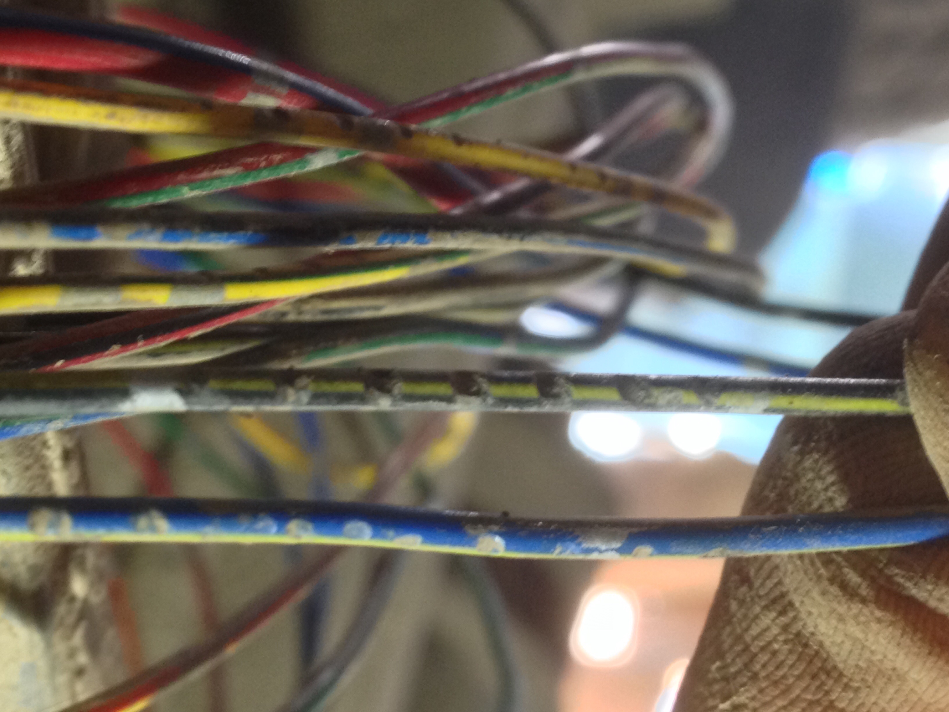 Это не замятости, а потертости. У меня 2 так же выглядели как синий с желтой полосой у тебя (ну похуже может). Повреждена изоляция, внутрь попала влага и медные жилы превратились в труху, вырезал кусок от края до края потертостей изоляции.razor-pro писал(а): Вот два провода тока замятоcтями отличаются и все