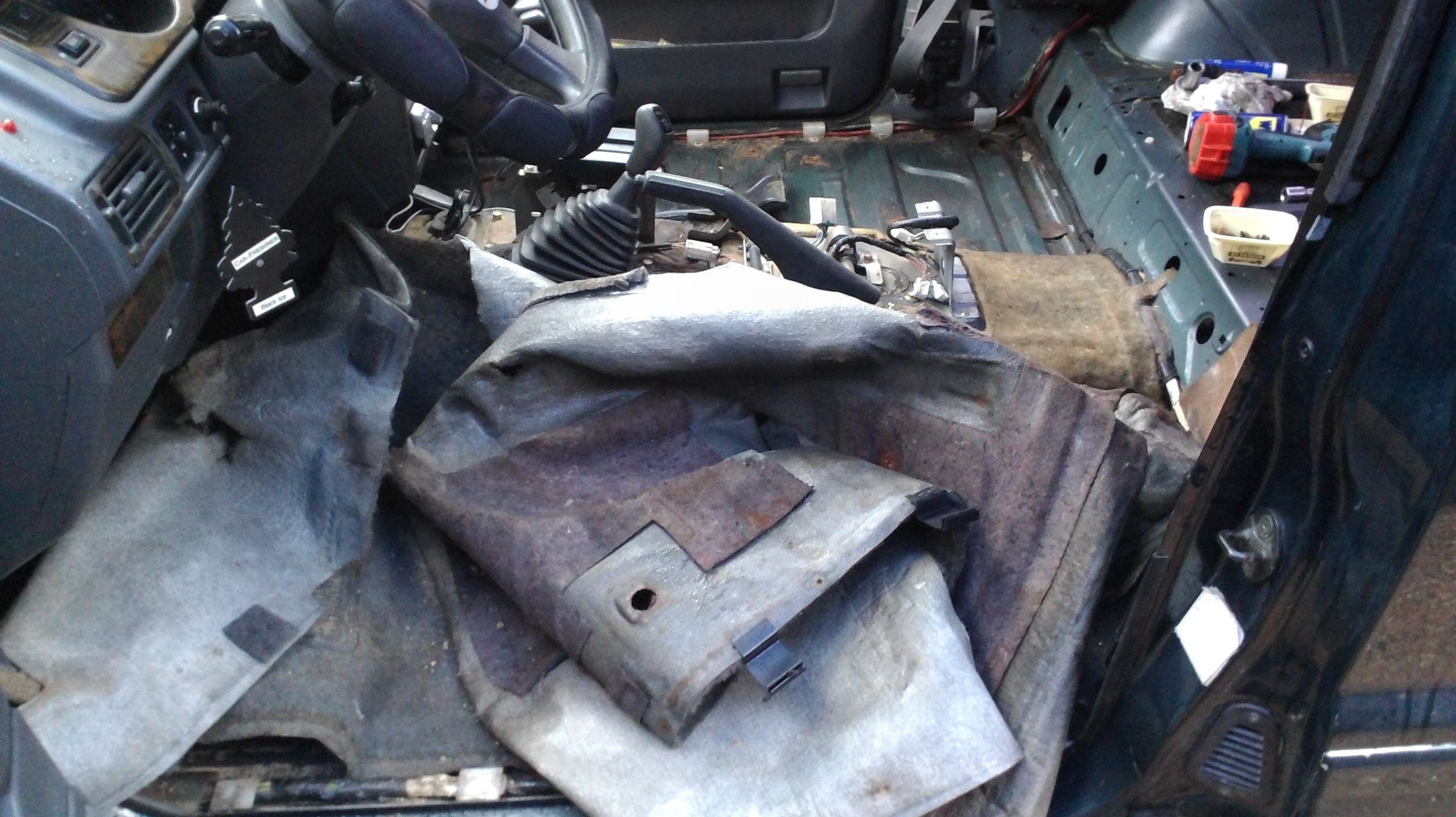 Все выходные занимался с машиной. Полностью разобрал салон (кроме торпеды и крыши). Как же всё по уму Ёппонцы делают! Снимаю шляпу! Обратил внимание, что к переднему ковру пола, за каким-то хреном приклеен снизу войлок, как раз там, где ноги пассажиров. С водительской стороны всё пучком! А вот с пассажирской, впереди, похоже где-то подтекает, и ржавчина начала вспучивать краску. Буду зачищать, грунтовать, и клеить эСТэПишную виброшумку. Так же безбожно текут сдвижные форточки. Я думал, что только в ниве так, ан нет. Чистил и продувал компрессором все дренажные отверстия в форточках, один хрен- пошёл дождь и ручейки с обоих сторон в ноги задних пассажиров. Думаю надо менять уплотнители и бархотки, вот только на что....?