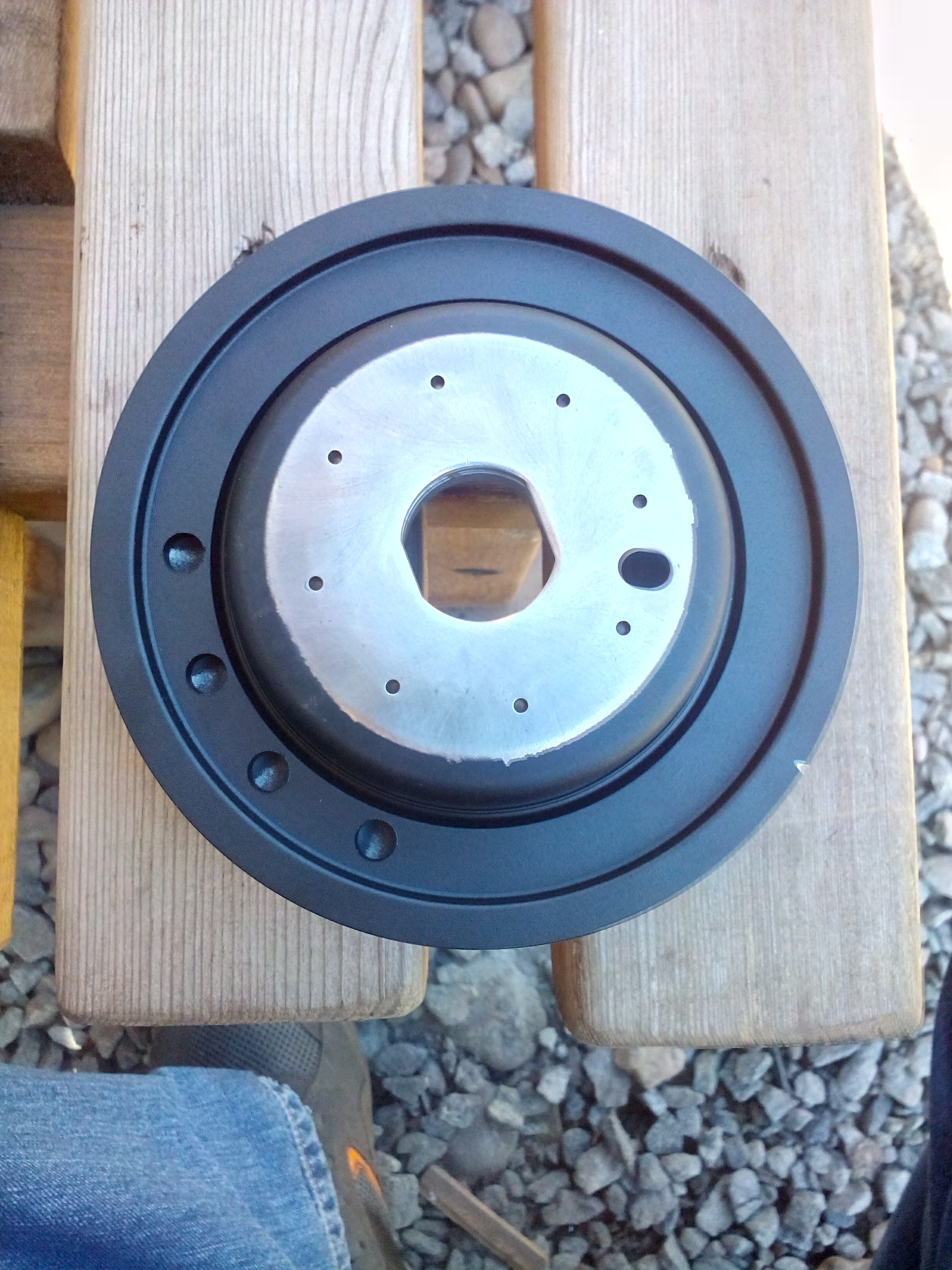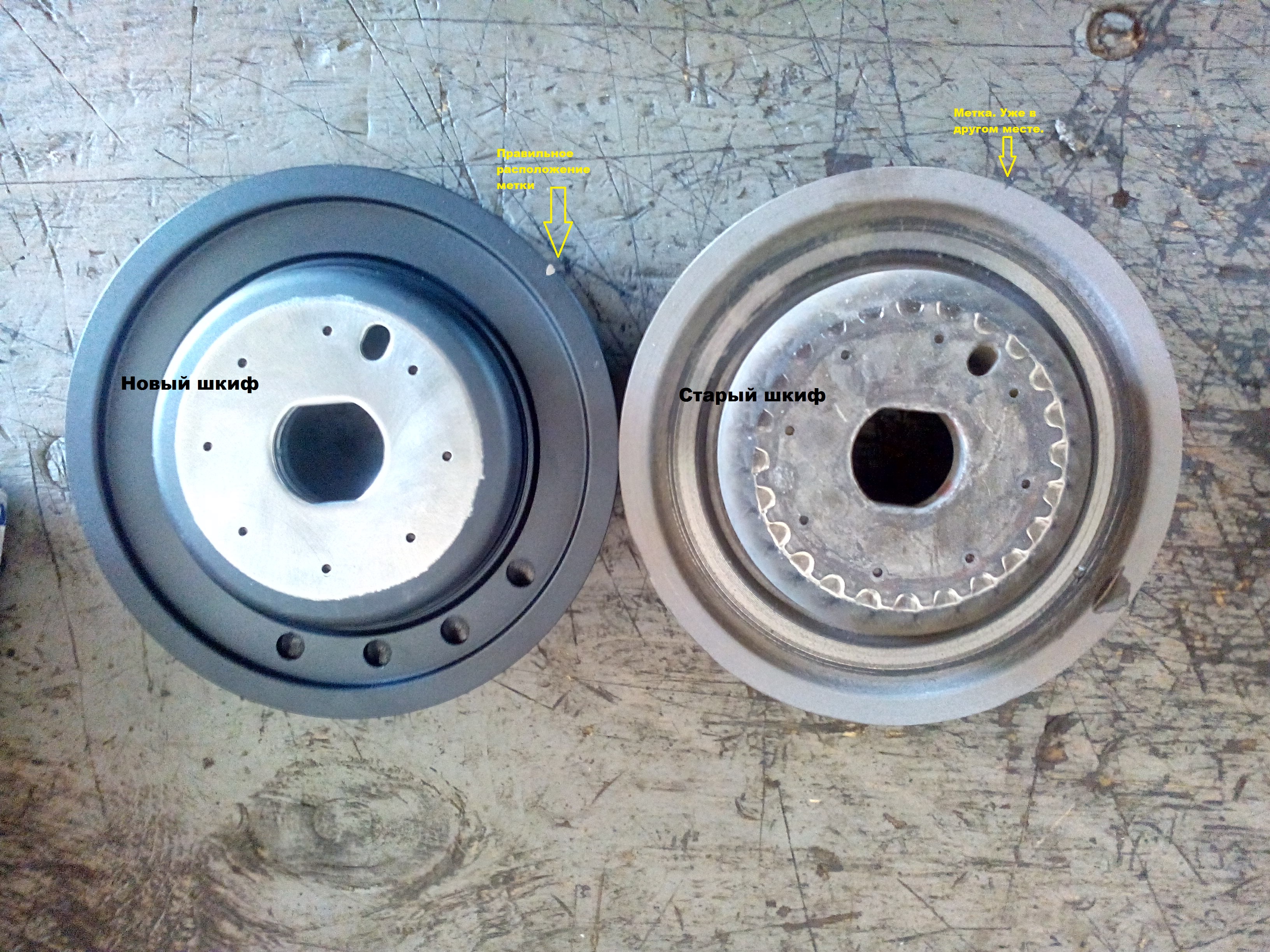Ну да ладно, продолжу. Как то по случаю взял я стробоскоп и решил проверить угол опережения (ранее неоднократно это делал и всё было хорошо). На шкиве из под низу почистил и пометил метку, что-бы её хорошо было видно сверху. Подключил стробоскоп, синхронизацию взял с первого цилиндра, закоротил на землю серую (коричневую) круглую фишку, что свисает в подкапотке. И в процессе измерения понял, что метка вообще в другом месте, это повергло меня в ступор. Глушу мотор, через некоторое время завожу, опять проверяю метку - и она опять в другом месте, и каждый раз она была в разных местах. и тут стало всё понятно - шкиф проворачивается по резиновому демпферу, и скорее всего он-то и скрипел периодически. В общем снял шкиф, зажал в тиски, накинул ремень и он от руки , правда с усилием прокручивается. Оказалось, что там даже видно, что он прокручивался, ибо резина в нём имела слегка пожёванный вид. Самое интересное, что этот шкиф был куплен в 14 году из Японии новый, оригинальный и прошёл примерно 150 ткм. или менее. Сейчас он недоступен для заказа, ибо снят с производства и т.п. Достал я свой старых шкиф, зажал в тиски, попробовал прокрутить - не удалось. поставил на нём метки от центра до края, поставил на авто, немного погонял мотор - глушил/заводил.. куда-то ездил, и оказалось, что и он тоже прокручивается помаленьку, ибо метки потихоньку уходят, и разумеется по насечке на краю шкива нельзя будет установить угол ОЗ. Это в общем-то и не беда, можно угол ОЗ и на глаз/слух выставить. Волнует то, что шкиф в один прекрасный момент может вообще сорваться и наделать беды. Кстати, с давно купленного мною "контрактного" мотора слупил шкиф, и он тоже оказался провёрнут. Так-же у меня сохранилась фото нового шкива на котором видно правильное расположение метки. Делаем выводы - не обязательно приводные ремни скрипят, все шкивы скорее всего провёрнуты. Причём откручивал и закручивал болт шкива пневмогайковёртом, что исключает его проворот методом зажимания ремнём для фиксации коленвала. Так-же вопрос - кто нибудь пробовал как-то закрепить, проклеить, или ещё как-то зафиксировать шкиф? Может кто-то проваривал?. но мне кто-то сказал, что шкиф может быть чугунный или из какого-то сплава по которому обычная сварка не канает. У меня возникла идея - выточить подобие чашки, которая будет фиксироваться так-же центральным болтом и заходить на внешний обод шкива и там фиксироваться мелкими болтами по кругу, но придётся насверлить отверстия и нарезать резьбу. Ну либо каким-то образом загнать под демпфер клей, например полиуретановый... Жду вашего мнения.