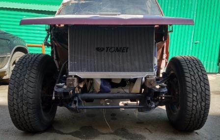 положение радиатора в профиль оч хорошее: радиатор алюминий конечно пневмостойка опирается в верхний шаровый, изгибающей нагрузки просто нет. Да и роль стойки чуть чуть поддерживать авто, основное лежит на торсионах, но они как следствие разгружены. Ну и самая большая проблема в прямом и переносном смысле... если кое что то можно будет переделать то это должно стоять на машине, хоть и первое время он не будет задействован. А пока, решение принимаю, или пилить переднюю часть рамы, или пилить кулер... но воздух для 1000+ очень требователен