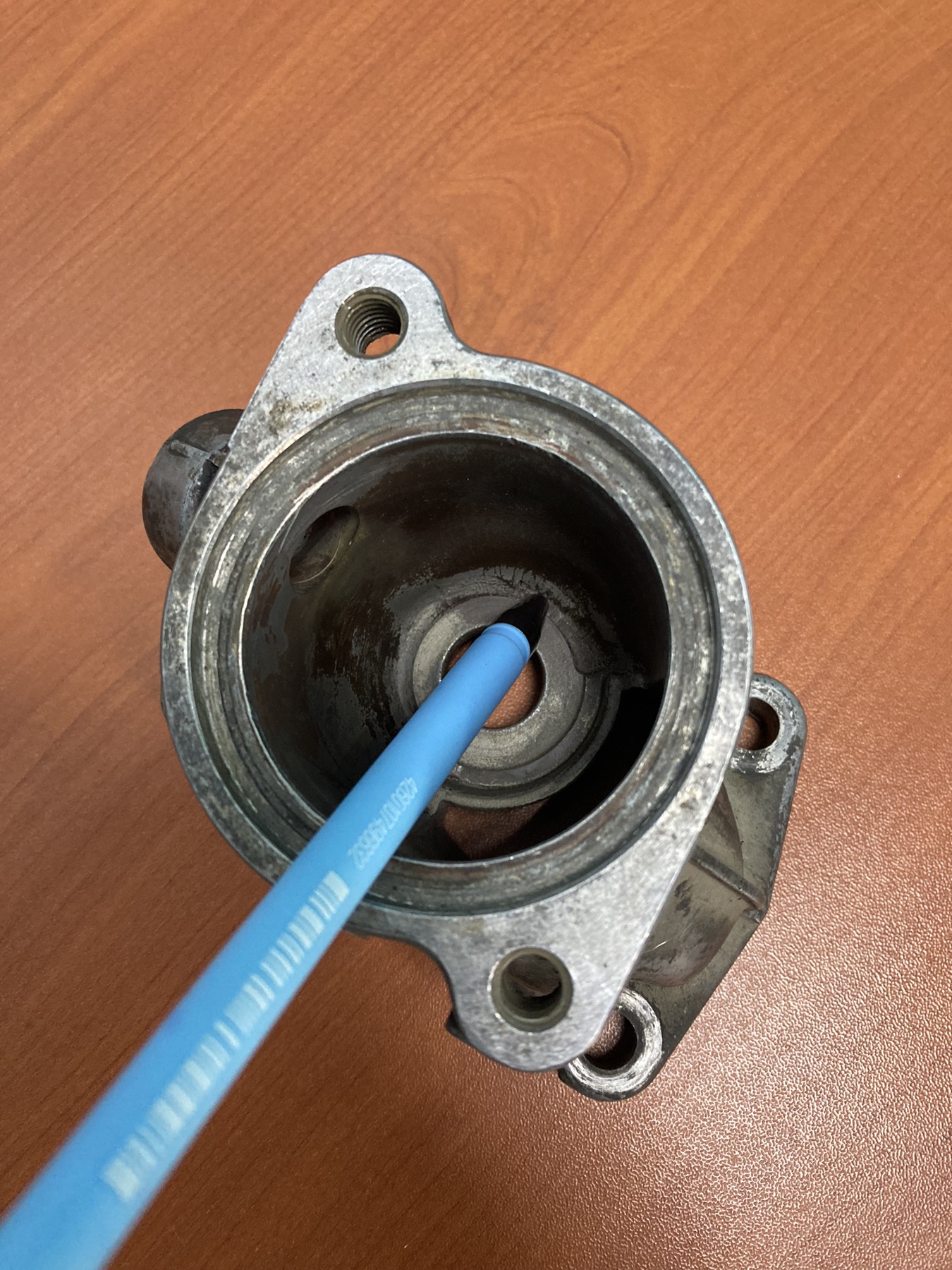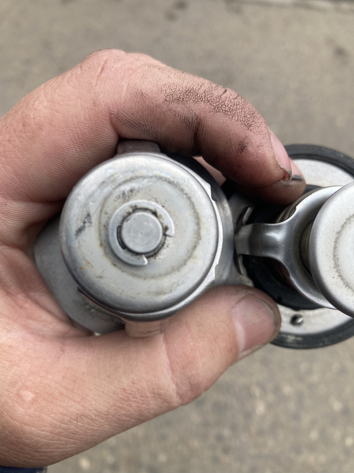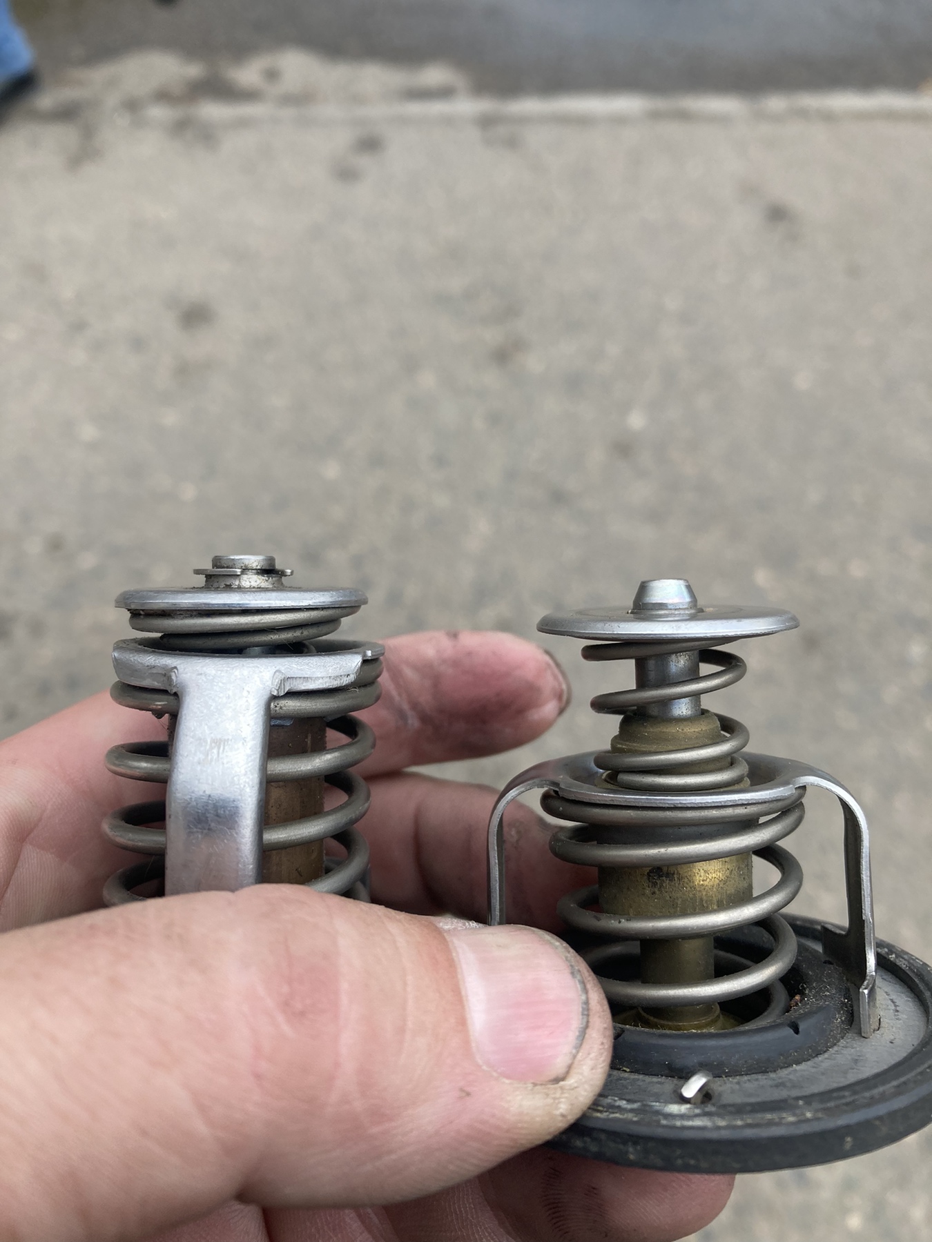 Чтобы темы не плодить, расскажу историю успеха на протяжении пары тройки лет. Понятно что в моторе уже делалось все от гильзования до замены башки на китай, новые термостаты, новые помпы, новые виски, вентиляторы, промывка радиатора. Проходит какое то время и опять по новой - перегрев где нибудь в луже или на горке, бульки в бачок. Причину перегрева догнать было не реально за эти годы, мысли обычные - мотор боится перегрева. Итак. Вот корпус термостата, там где ручка - видно что плоскость каким то образом стерлась. Каким - загадка, можно изначально кривые руки туда слазили. Вчера купил новый корпус, там это бортик мм 2-3 высотой и равномерно по всему кругу. Итак история: ставим новый термостат, так как прилегание под углом через какое то время происходит искривление штока. В итоге новый тама через полгода открылся только на 95 градусах. Сегодня его варил прямо в корпусе. Купил новый корпус, поставил сначала старый термостат, как оказалось зря, они уже кривые все 3 штуки. Сегодня в обед поставил новый тама, правда на 76 градусов пока, но сам факт - машина сразу поехала, стрелка не шевелится. В пятницу поменяли прокладку очередную и сразу после выезда с гаража - 95 градусов на голове. Нижний холодный или еле теплый. Выкинули термостат полностью, все работает. Бульков нет. Начали изучать термостаты, несколько штук и нашли смещение малого круга от центра. Сняли корпус, купили другой и сравнили.