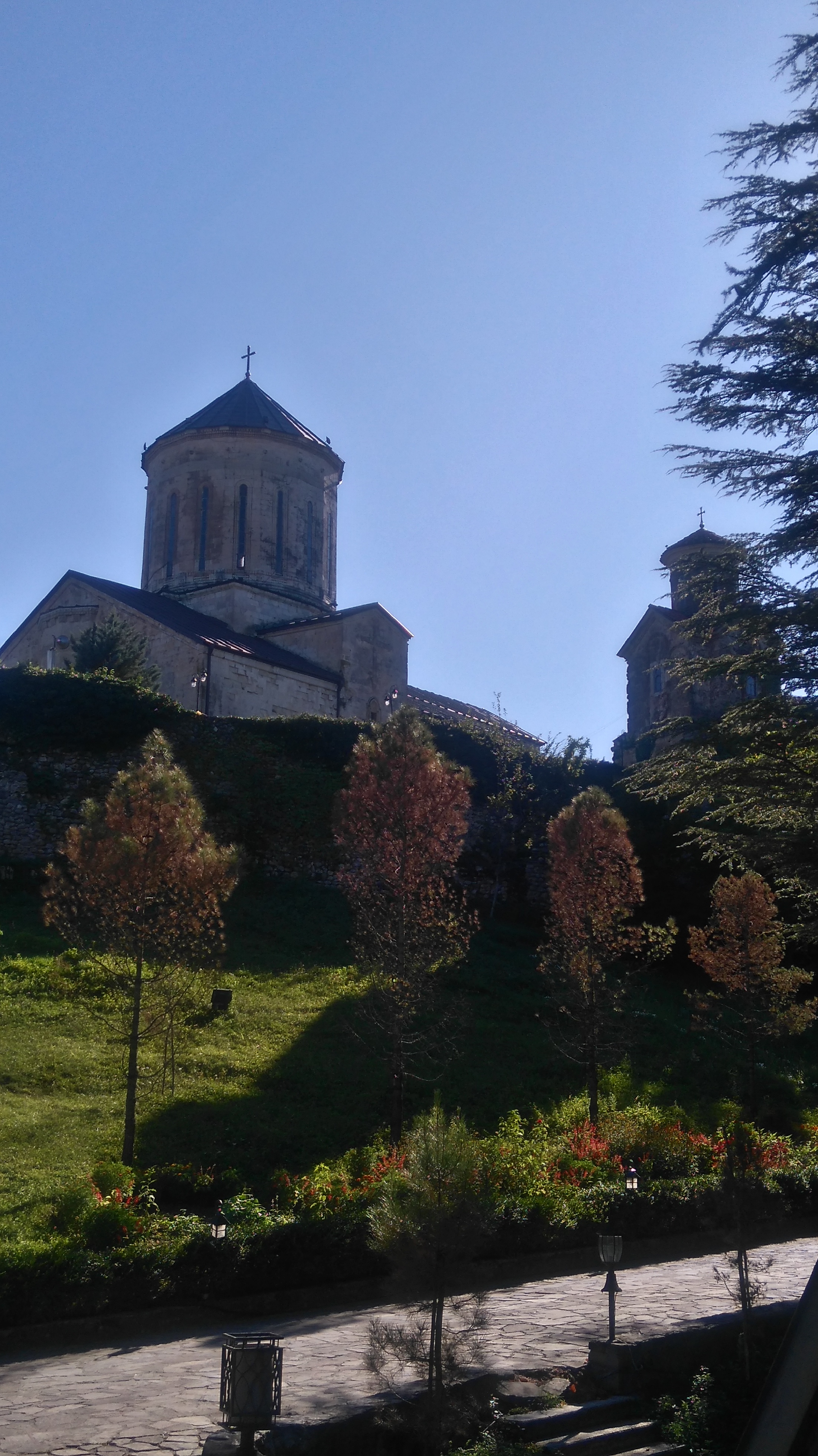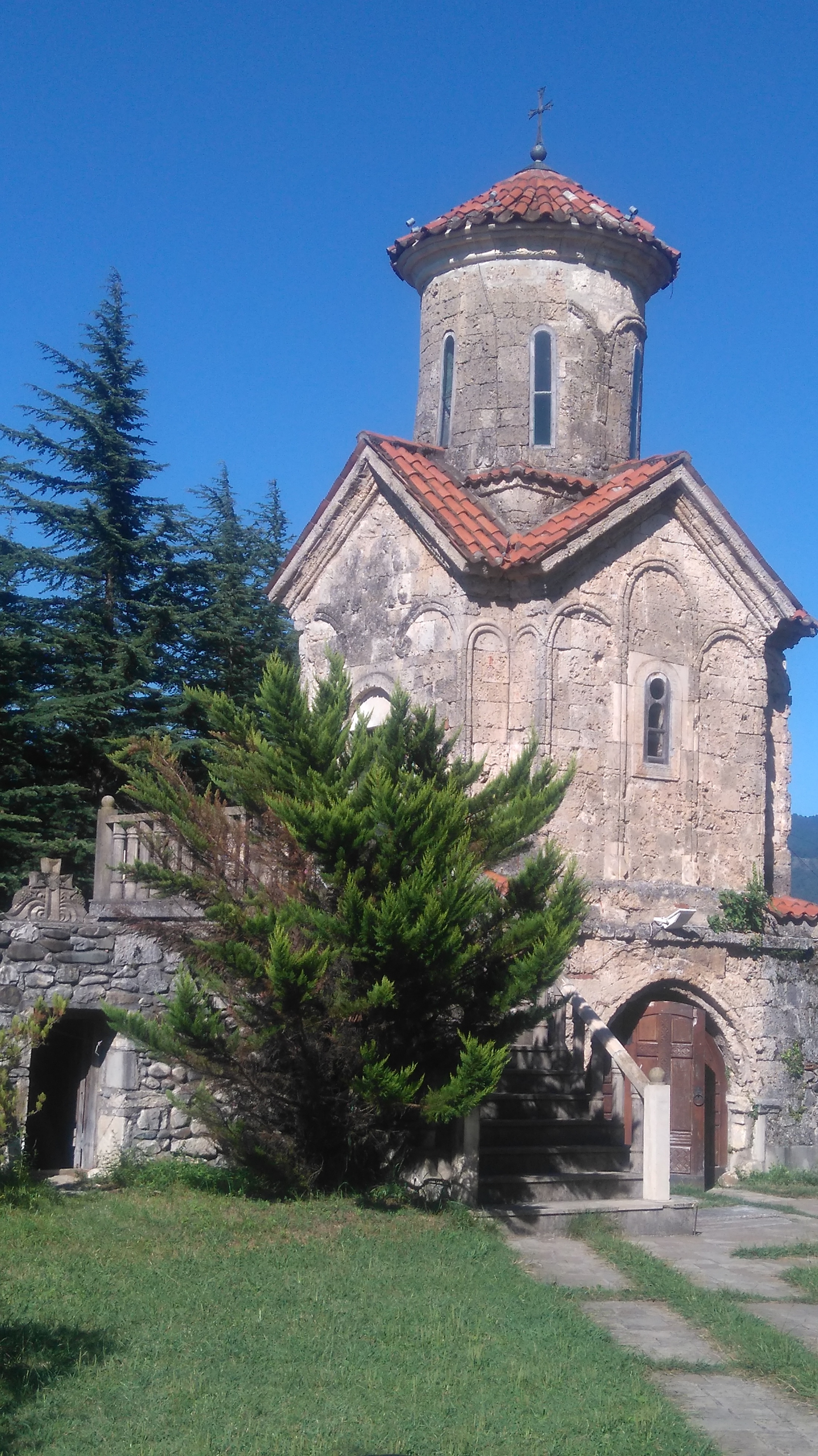 А на обратном пути нужно заехать в Мартвильский монастырь в одноименном городе. Еще его называют Чкондиди, что переводится, как место дуба. По легенде, на его месте рос огромный дуб, у которого язычники приносили в жертву детей. А Андрей Первозванный, когда пришел на Грузинскую землю проповедовать учение Христа, срубил этот дуб и построил на его месте часовню. С 7 века на этом месте стоит монастырь. В этом монастыре воспитывался Давид Строитель, епископы этого монастыря выполняли функции первых визирей-читай премьер министров в золотой век объединенной Грузии. Монастырь служил усыпальницей Абхазских царей, а в последующем великих князей Дадиани. В нем похоронена великая княгиня Екатерина Дадиани, родная сестра жены Александра Грибоедова и выдающаяся политический деятель Кавказа в 19-ом веке.
