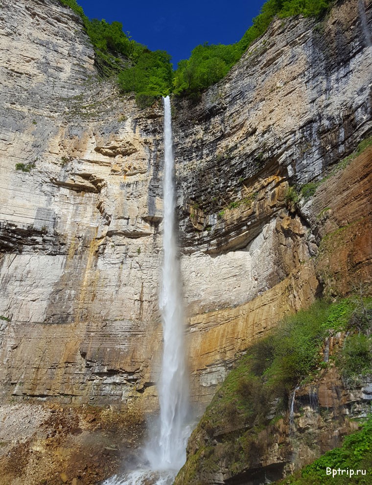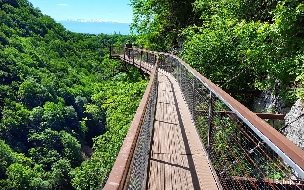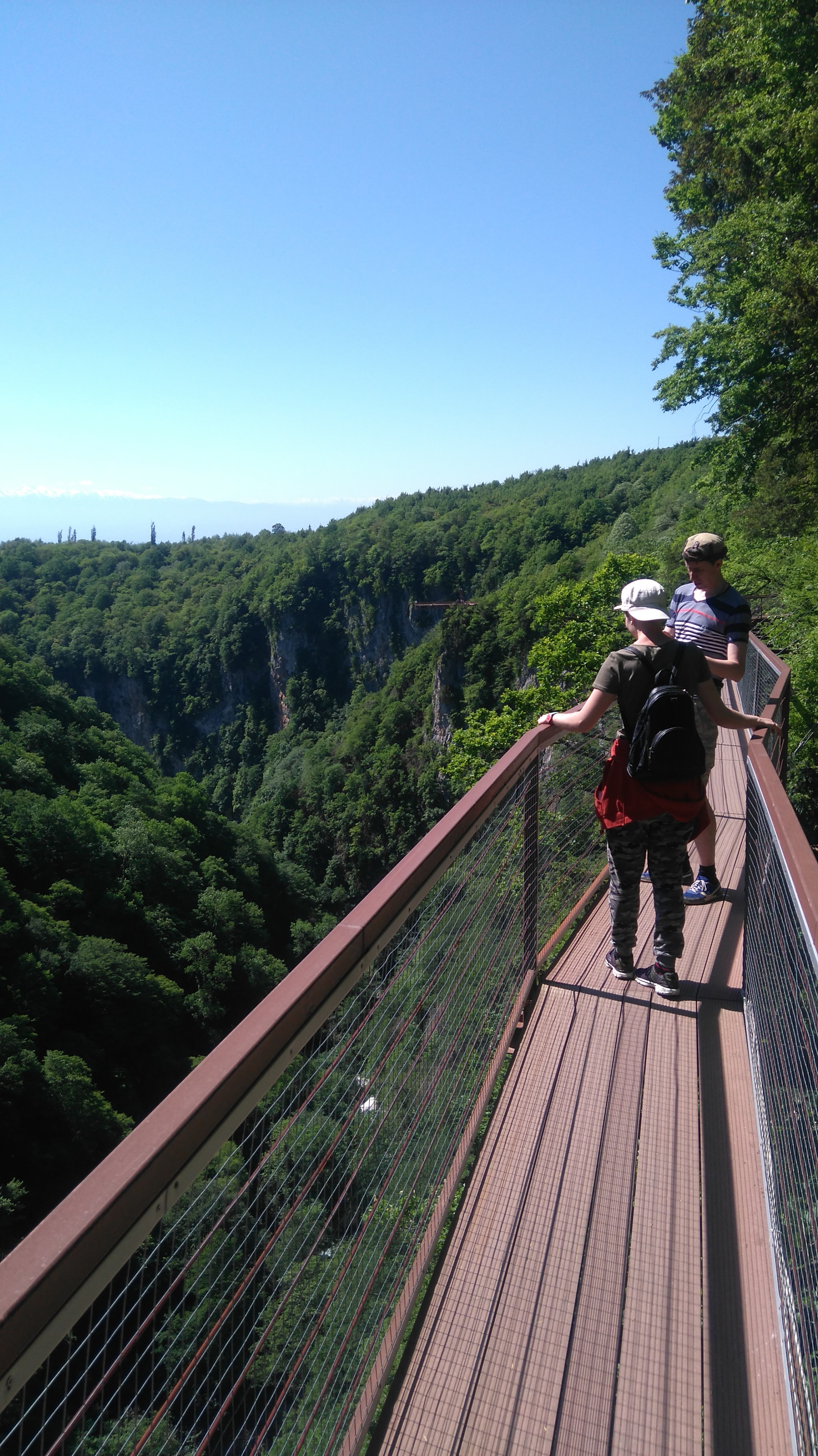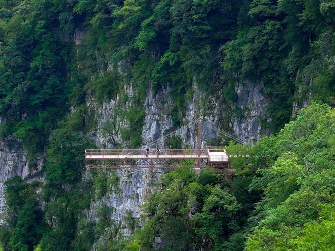И так, пешком спускаемся по парку и выходим к пропускному пункту , где необходимо показать билет , что бы попасть на подвесную тропу каньона. Сразу оговорюсь, что детей младше 6 лет и ростом ниже 90 см на тропу не пускают. Тропа подвешена на обрыве с высотой доходящей до 200 метров захватывает дух и открывает живописные виды. Заканчивается тропа смотровой площадкой выступающей от края пропасти на 20 метров и на высоте 150 метров. Не все из наших гостей-туристов отважились на нее пройти... После площадки возвращаемся к началу тропы и оттуда на внедорожнике прорываемся к визит-центру, где оставили свой автомобиль. Ну а после каньона надо проехать выше в горы еще километров около 10 и увидеть самый высокий водопад в Грузии- Кинчху. Вода падает с высоты 100 метров и не всегда долетает до земли одной струей, а распадается на капли . Впечатляет. Сейчас там обустроили удобную тропу и можно прогуляться к нижнему каскаду водопада.