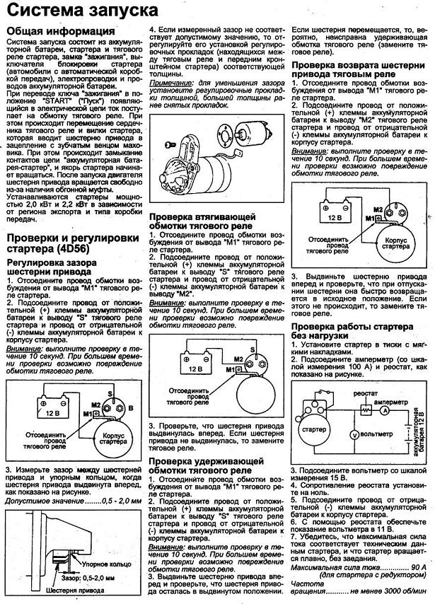 По стартерам хочу немного добавить правды, исходя из практического опыта. Я не знаю откуда взял этот талмуд ЕвгенийТ, но там есть неверная информация(кстати такие "косяки" встречаются довольно часто в пособиях, в инструкциях). ...Проверка втягивающей обмотки тягового реле..., описана и показана неверно. Эта схема работать не будет, потому как вывод "2" никуда в стартере не соединён. На него одевается плюсовой толстый провод уже непосредственно когда стартер ставится на двигатель. А чтобы схема проверки сработала надо минусовой провод соединить с выводом "1" после сброса провода с вывода.