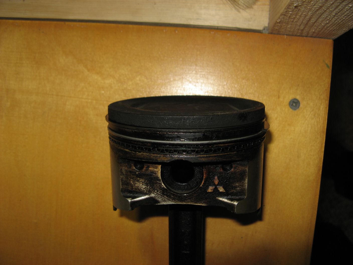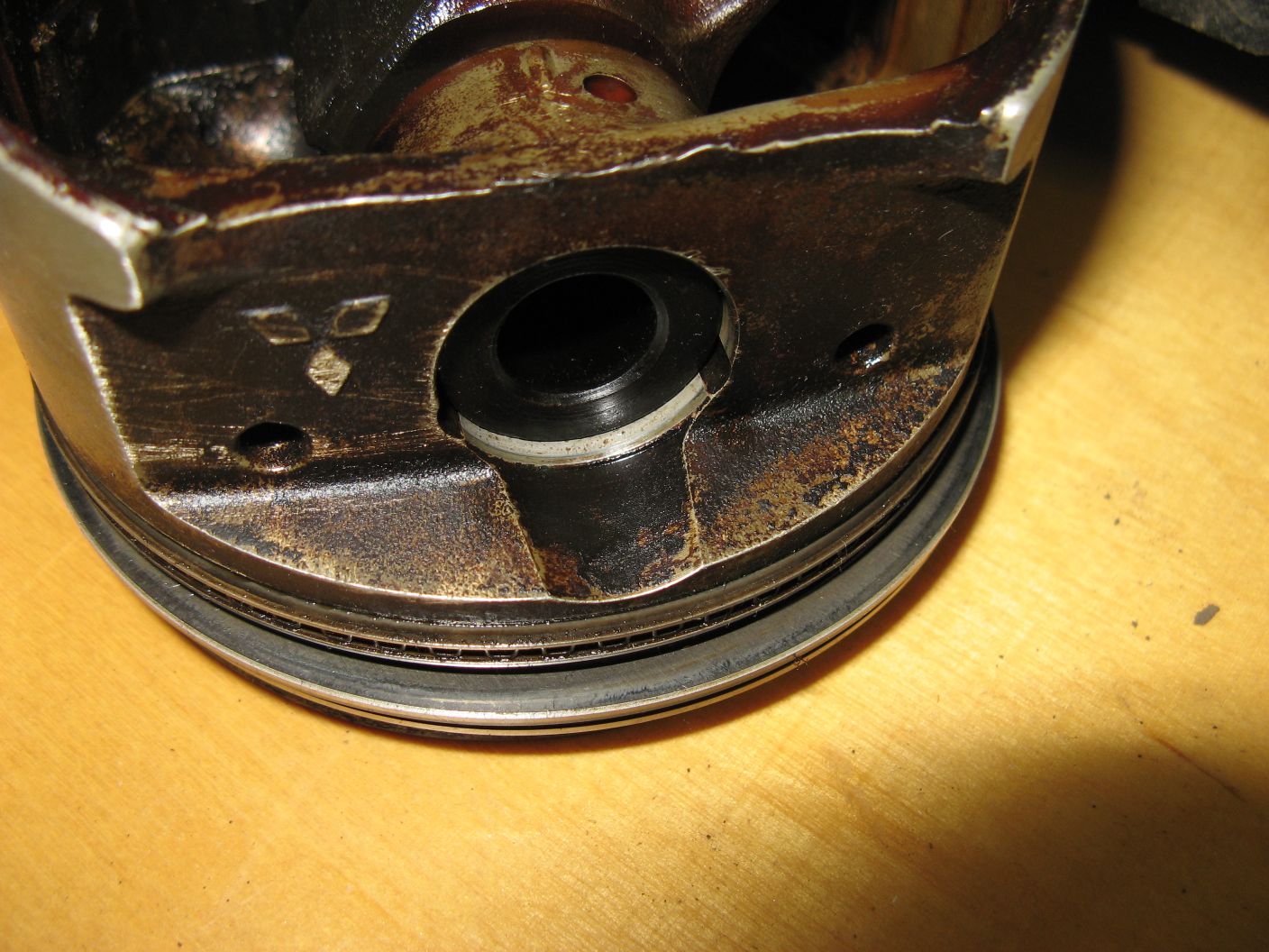 А может и не кривой. Достал еще один поршень, из нестучащего цилиндра, там та же картина - на одной стороне над пальцем стерт огневой пояс, на другой стороне нагар (два нижних фото). Вот здесь указано, что это признак гнутого шатуна. Похоже это не причина стука, а норма для мицубиси? Надо резать поршень, смотреть палец. Если шатун прижать к поршню и поелозить вдоль оси пальца, то чувствуется ступенька, а если оттянуть шатун от поршня, то ступеньки нет. Хотя может это просто нагар. В посадочном отверстии поршня износа нет, это видно, если сместить палец - ступенька тактильно не ощущается. Но опять же, на поршне в здоровом цилиндре та же картина со ступенькой, может чуть менее выраженная. Чудеса в общем, опять ничего не понятно.