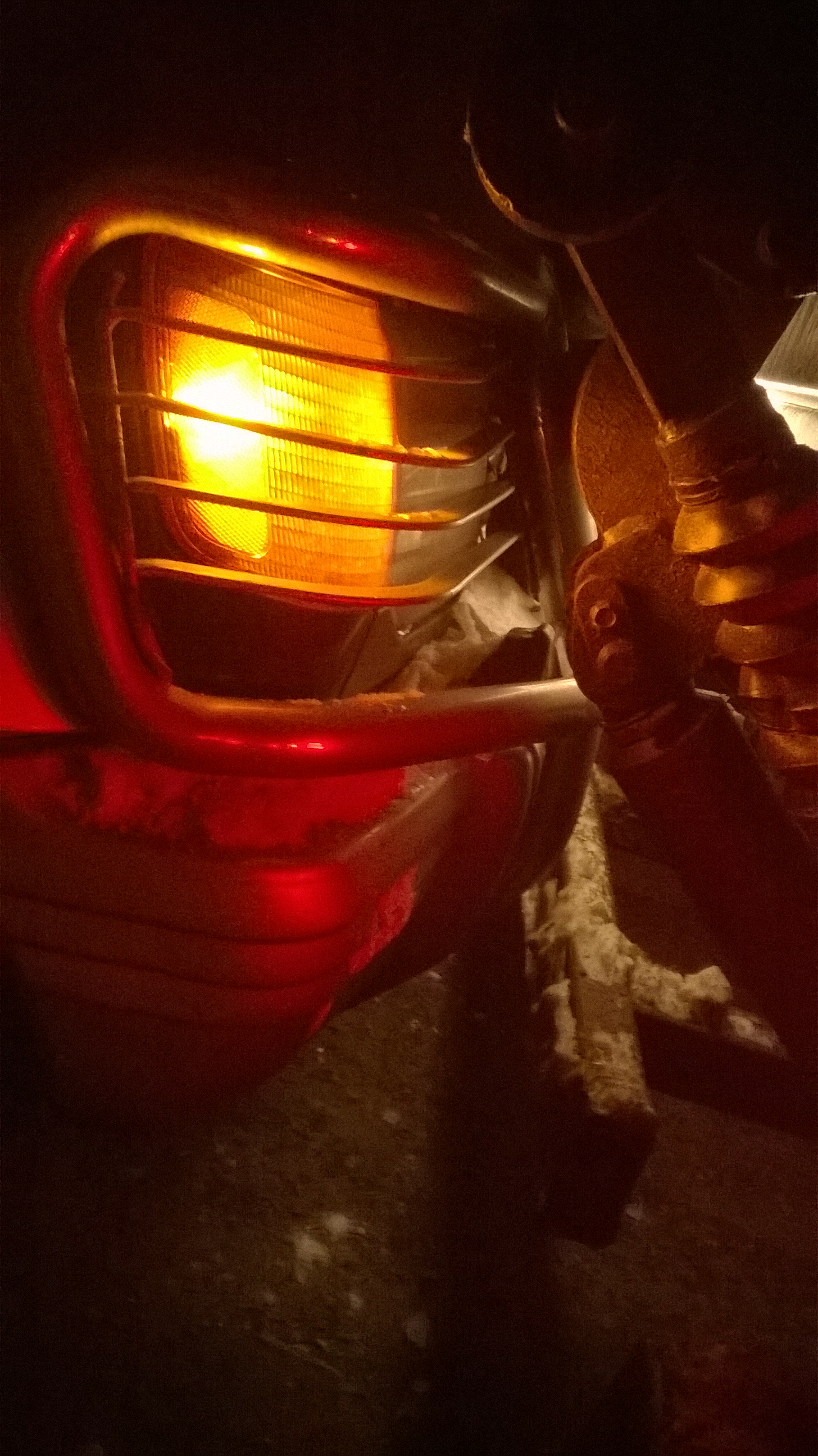 Результат, он точно лопатой уперся в кенгурин у меня сломана противотуманка, кажится немного бымпер назад отполз, капот прижат кингурятником, есть елезаметные вмятины на капоте, кенгурин все принял на себя - его помяло. Но если бы кинга небыло, то я бы недосчитался бы фар, решетки и капота. Повезло.