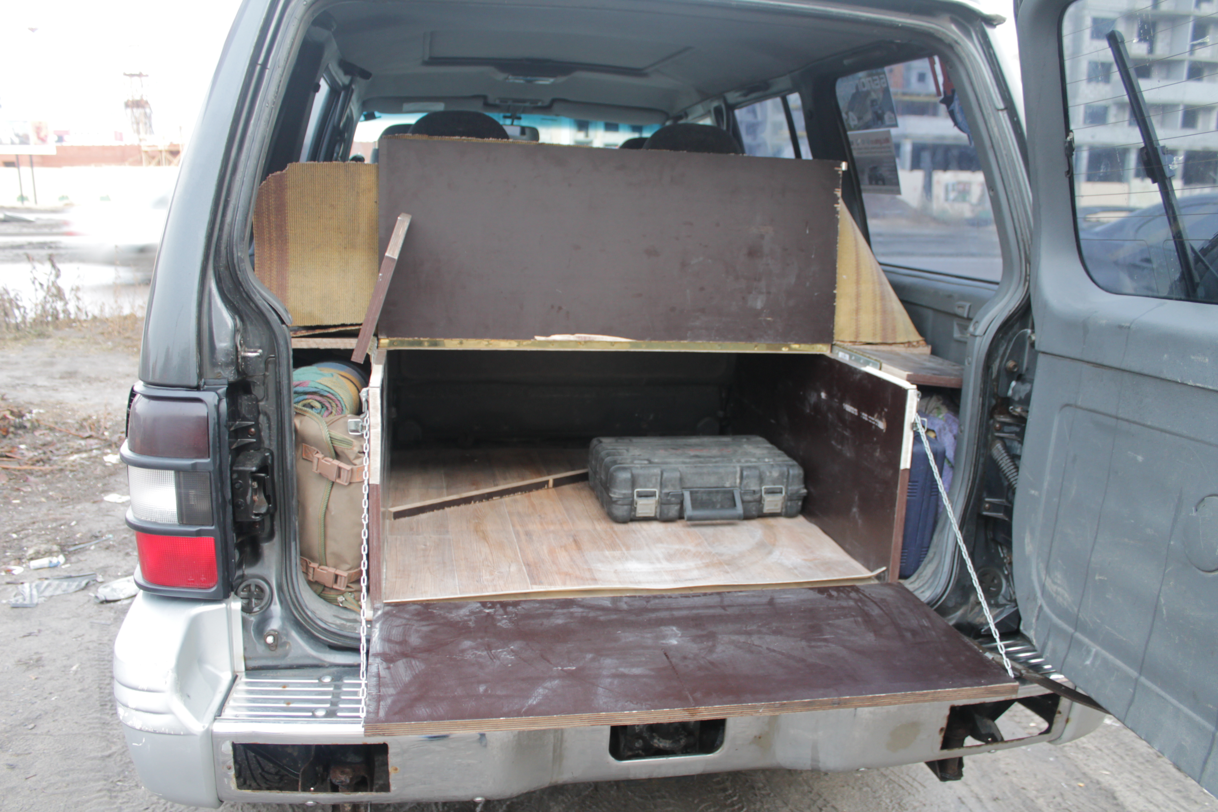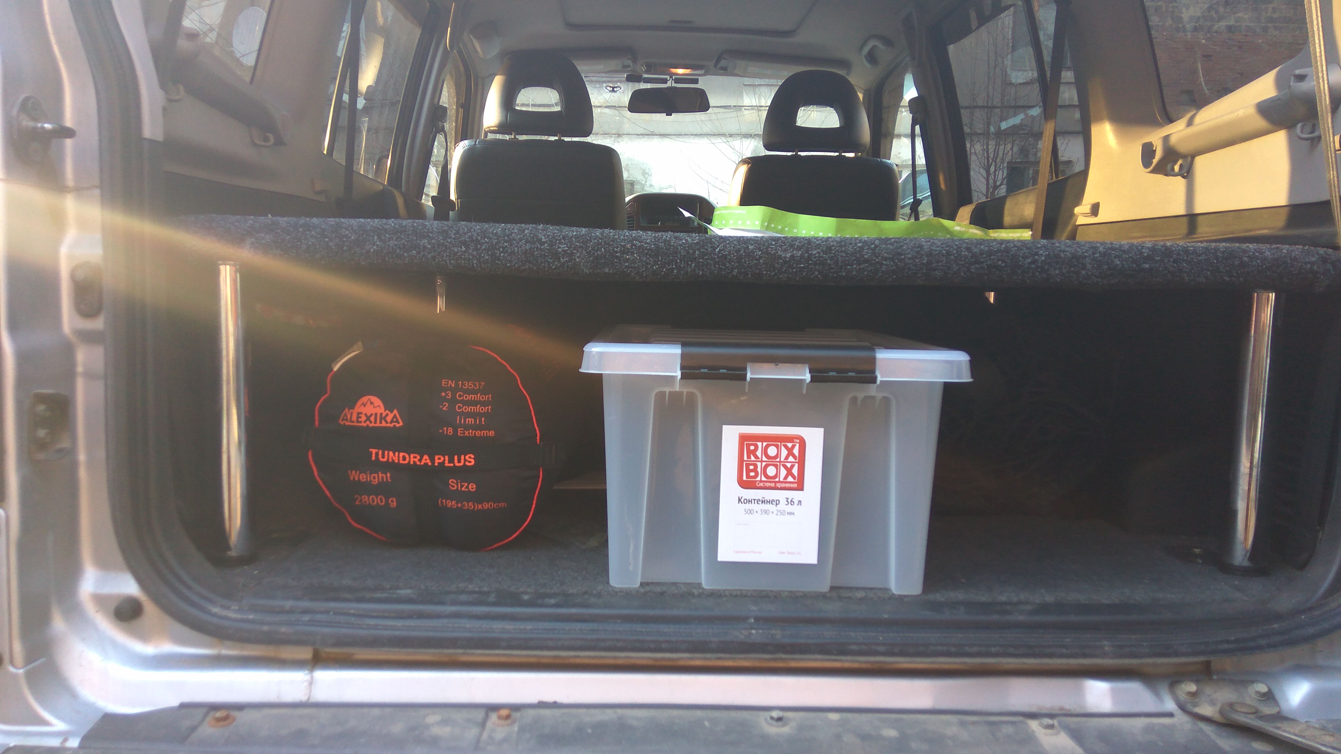 На фото видны две площадки для крепления ножек для дополнительного крепления раскладывающиейся полки. Ноги на резьбе. Задняя часть второй половины спальника одной стороны ложится на сложенную спинку заднего сиденья. Другая половина стоит на ножках. Ножки на резьбе вкручиваются.Sasha1970 писал(а):Бочка с кухонной утварью, газовый баллон, большой рюкзак и т.д. боюсь не войдут стоя. На задних сидениях спинки просто положены вперед на сидушки, правильно? Будь добр. Сделай фото мебельных опор и вид с задних боковых дверей в разных положениях полки.kotei писал(а):Начну с грустного.Sasha1970 писал(а):Класс. Кинь в кличке подробности и чертежики. Я когда на рыбалку в Астрахань или на Кольский езду, машина битком, даже задние сидения снимаю. Только два в впереди. Боюсь, что с полькой все не поместиться. А полка с'емная или намертво прикручена? На ближнюю рыбалку в самый раз было бы.